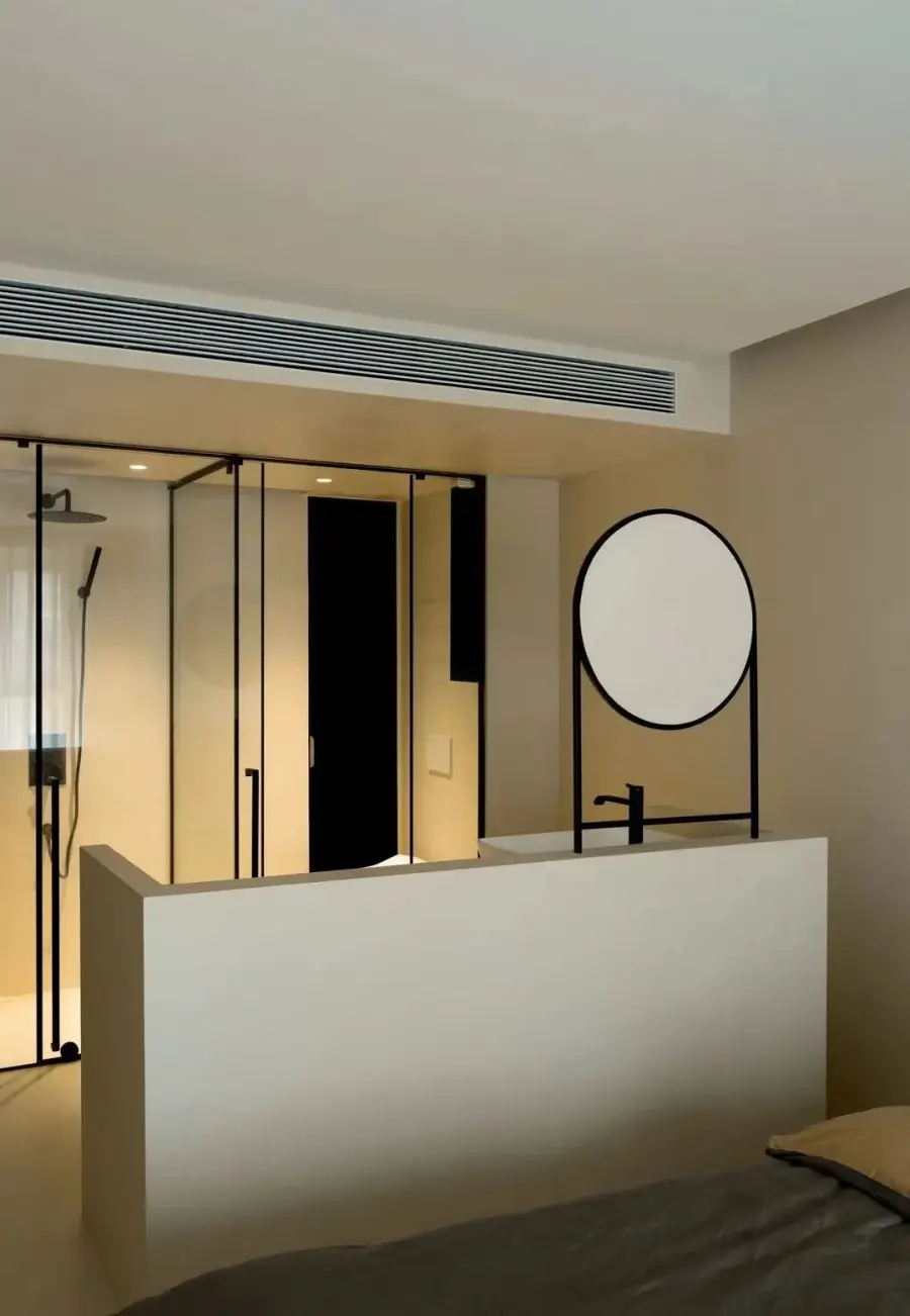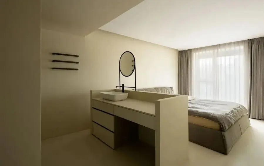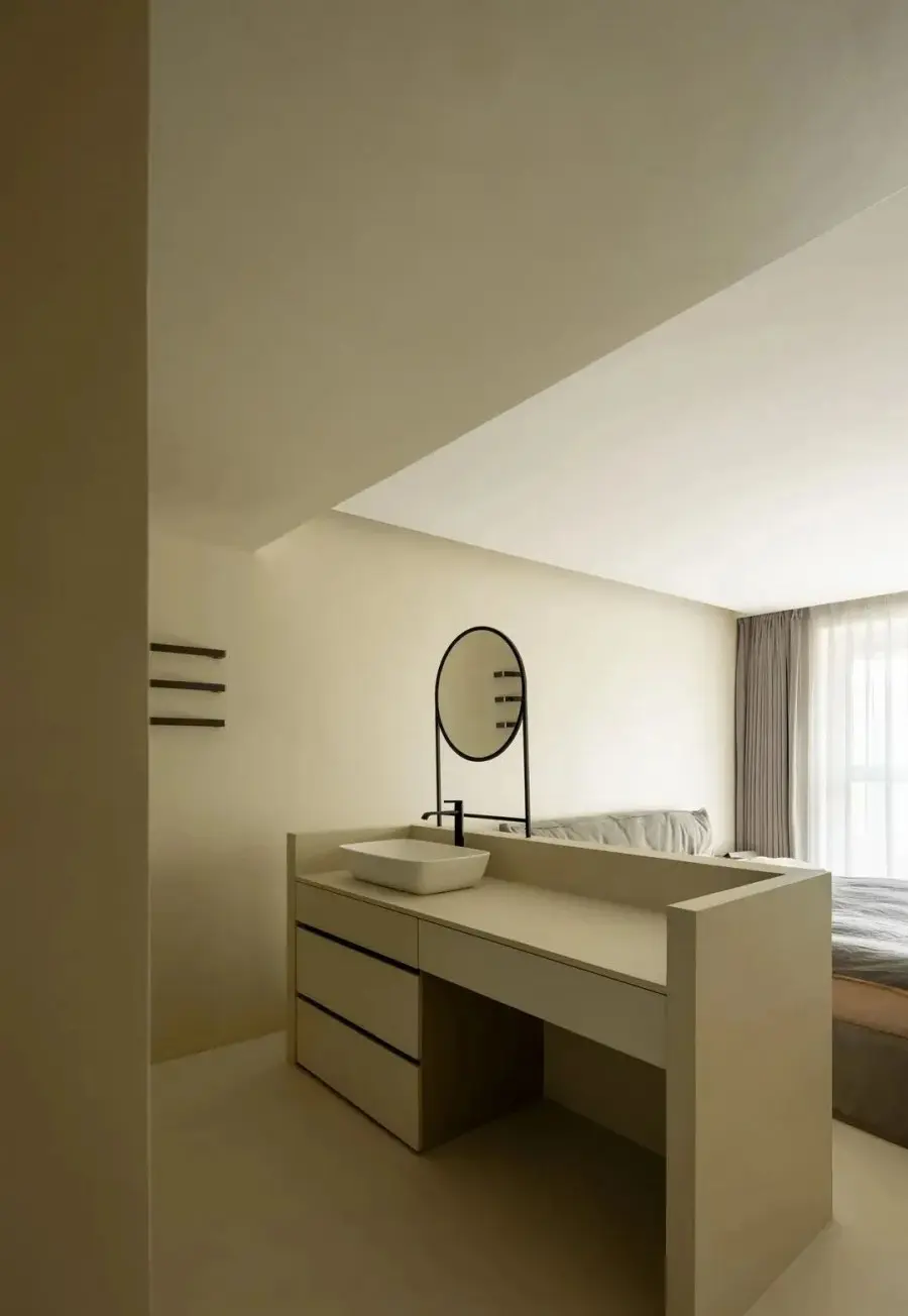 马桶区与淋浴区采用玻璃墙,尽可能保留空间采光,一门到顶更显大气,卧室空间视野也更为通透。悬空镜背面同样为微水泥装饰,与空间墙、顶、地形成呼应,保证空间整体性。