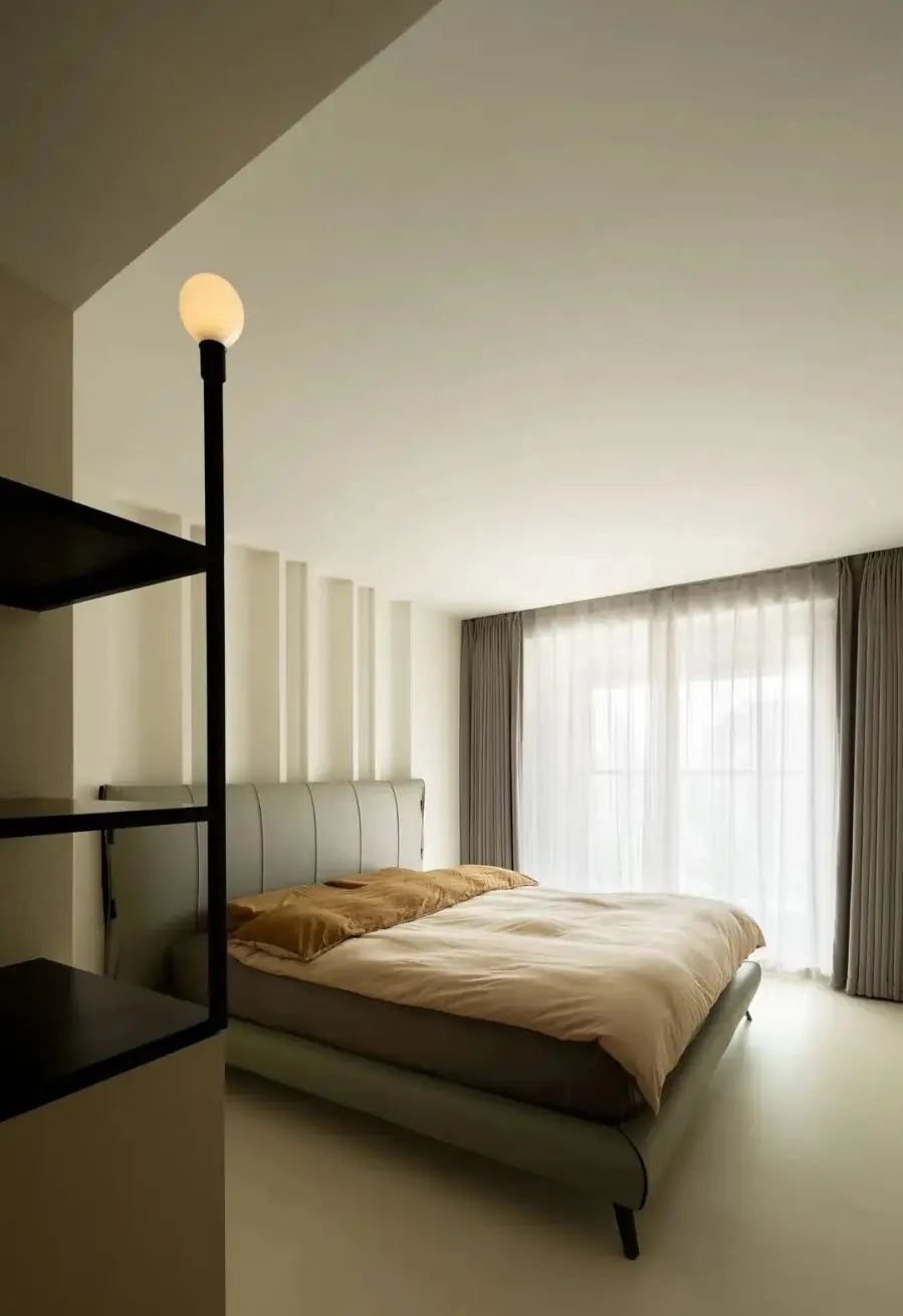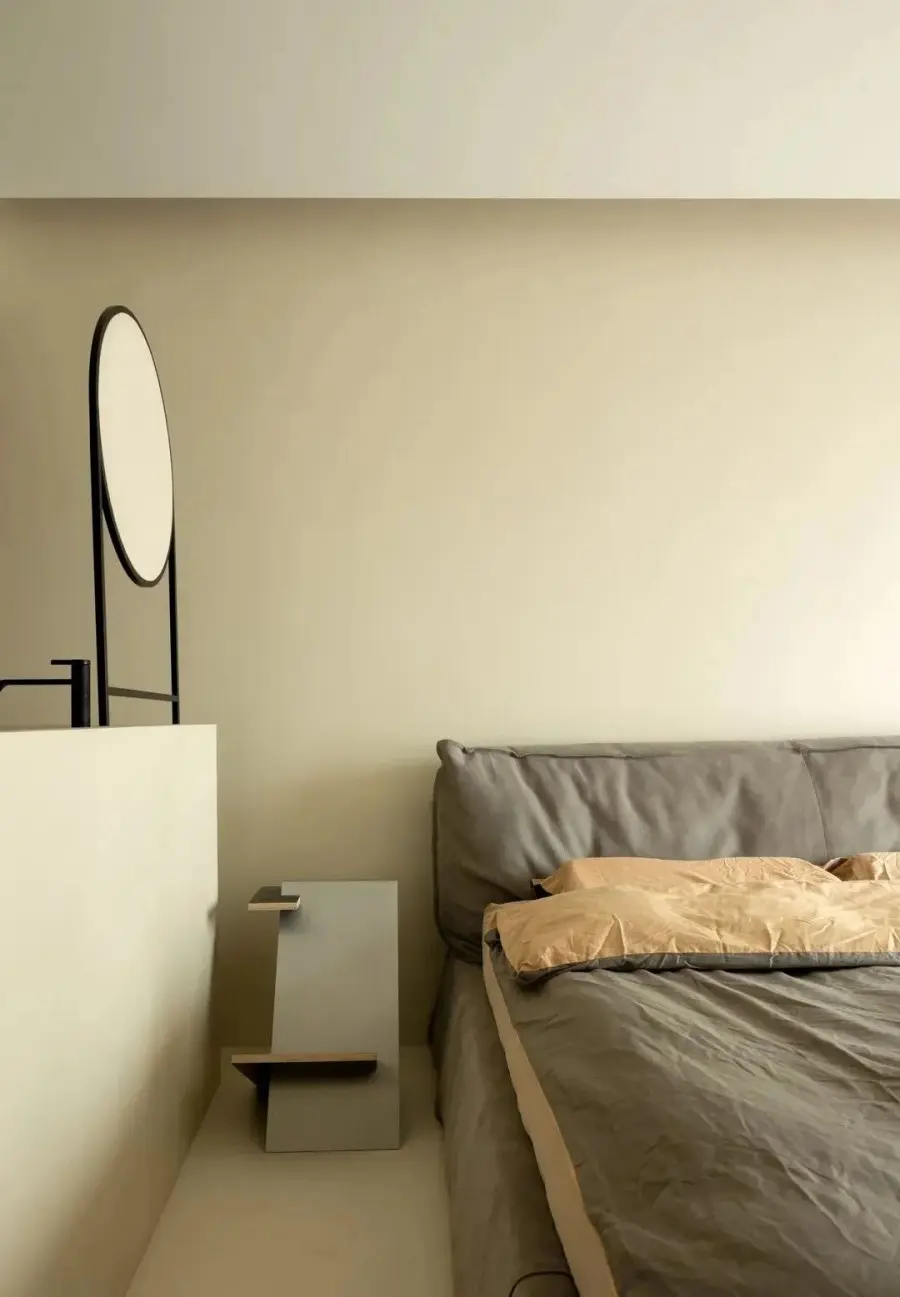 低饱和纯色系空间纯粹安静,双人床舒适柔软,搭配冷灰调床品,与暖灰调微水泥材质和谐统一又层次分明,营造内敛静谧的睡眠空间,给予屋主最为放松的氛围感。