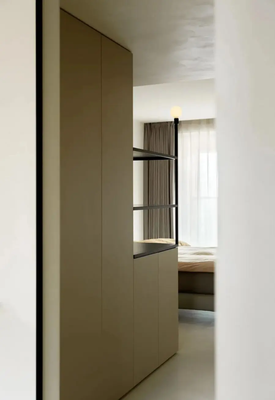 作为90后,屋主其实也没有特定的需求,只大概描述他想要的样子:干净、纯粹、温暖,简单一点。所以我们在硬装上采用“减”的手法,墙顶地一体延续整个空间,将纯粹的底色铺垫好,表现力则交给了软装。采用微水泥、实木、金属等多种不同的元素去碰撞,构造一个丰富而有序的极简空间。