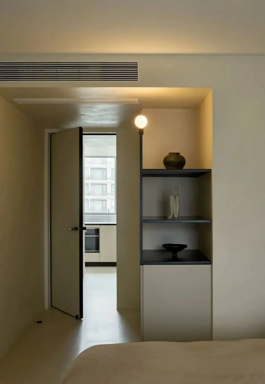 面向床体一侧近设计成开放柜,补充床头柜收纳及置物功能,平常无人居住时可作为展示空间,收藏展览屋主的珍贵摆件等。下方柜体面向床体方向,更方便日常使用。