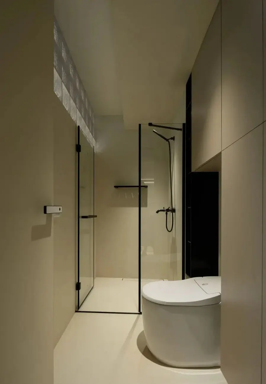 上方墙体改装玻璃砖,光线通透,空间视野更为开阔,将排风口规划于右侧,并未铺满顶面,给予玻璃砖墙引光入内的设计最大的发挥空间。借用背面主卫空间安置水箱,同时利用剩余空间打造收纳柜,满足洗手间储物,淋浴间采用玻璃隔断,不遮挡视野和采光,墙壁嵌入搁板,用以放置洗头膏等物品。