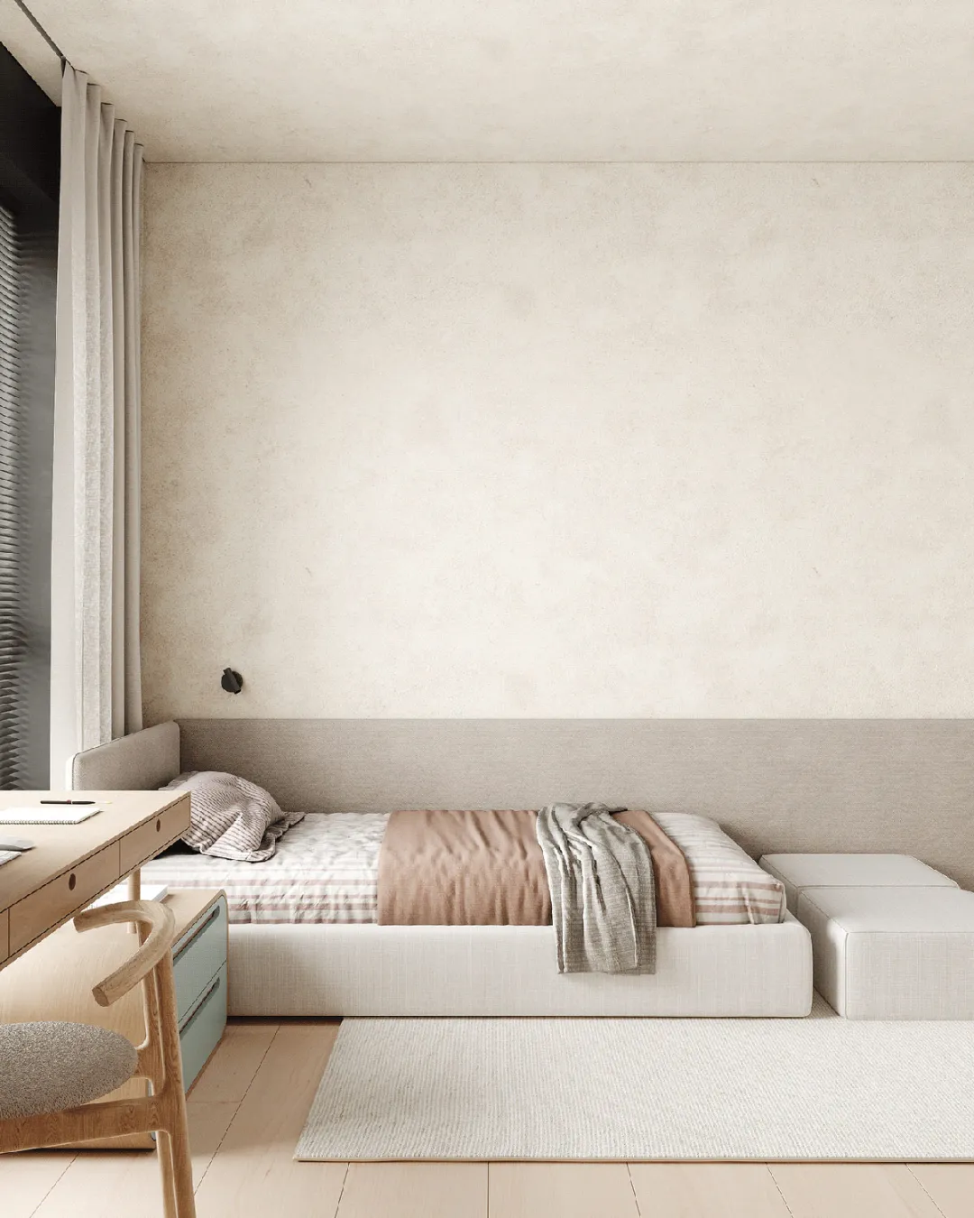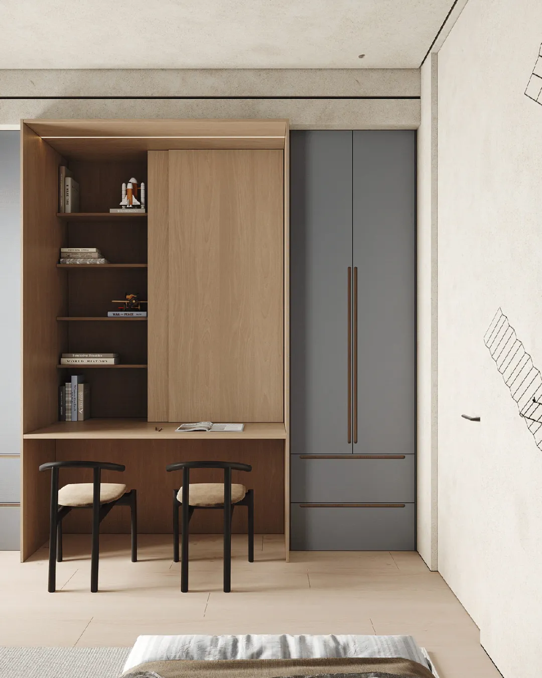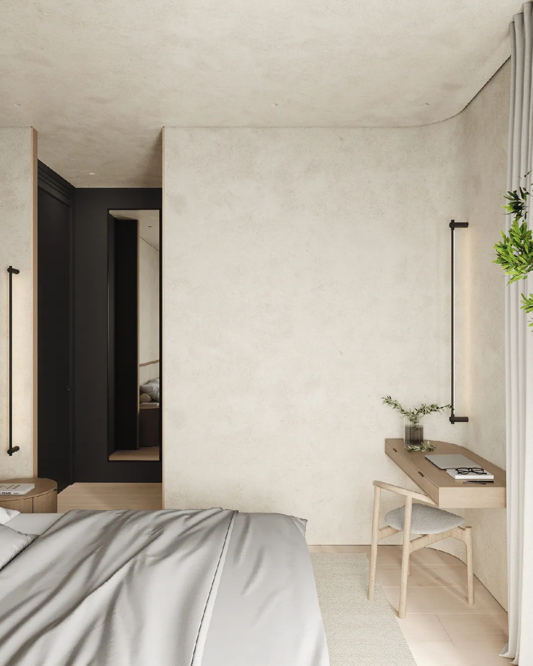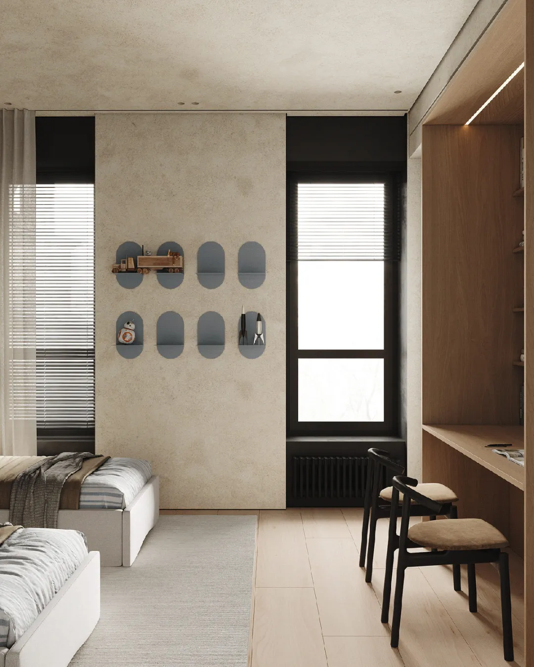 开放式的室内空间色彩柔软,光线充足,黑色元素的点缀为中性环境增添深度和光泽。客厅采用围合式布局,严谨中透着轻松与舒适;厨具和电器利用中段橱柜空间进行收纳设计;卧室延用客厅的设计格调;儿童卧室明亮、清新、时尚,配有定制的儿童书桌设计和装饰性搁架墙;亲子房是孩子们休息的地方,拥有自己安静的工作空间;浴室灵感来自现代梳妆台和大胆对比的黑色装置。
