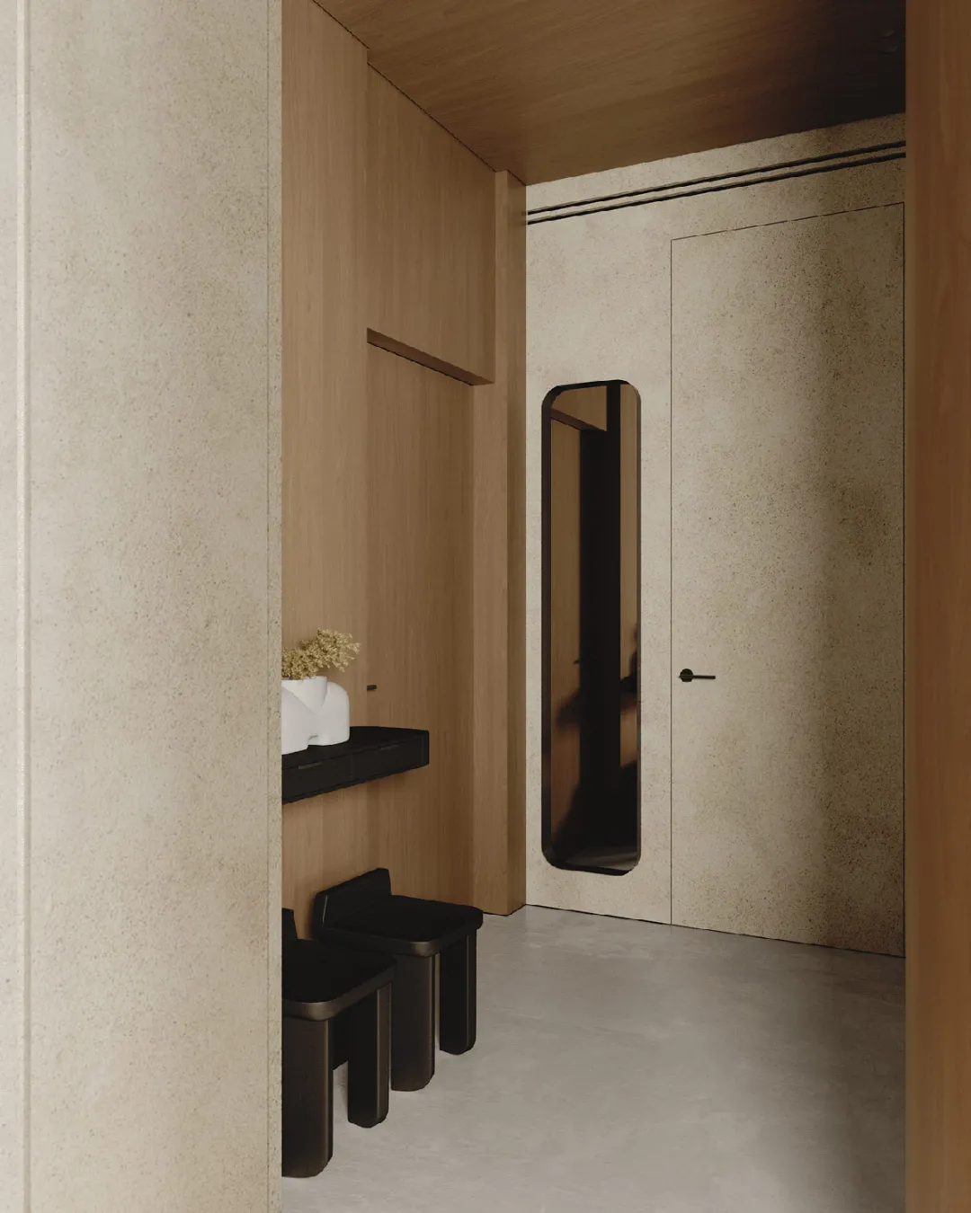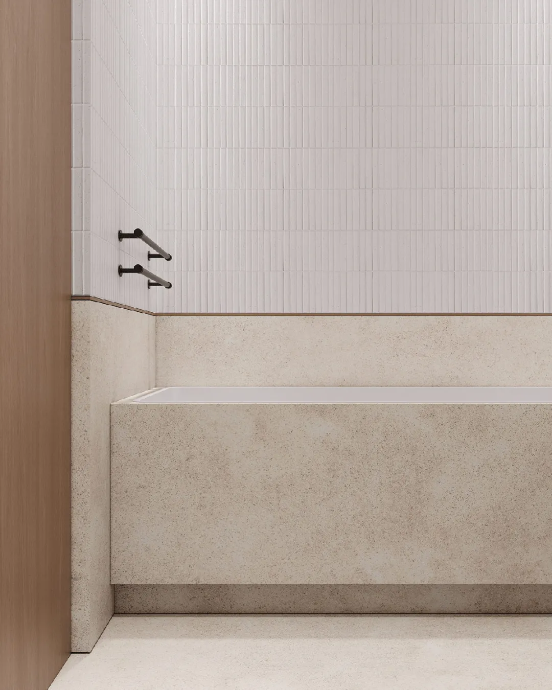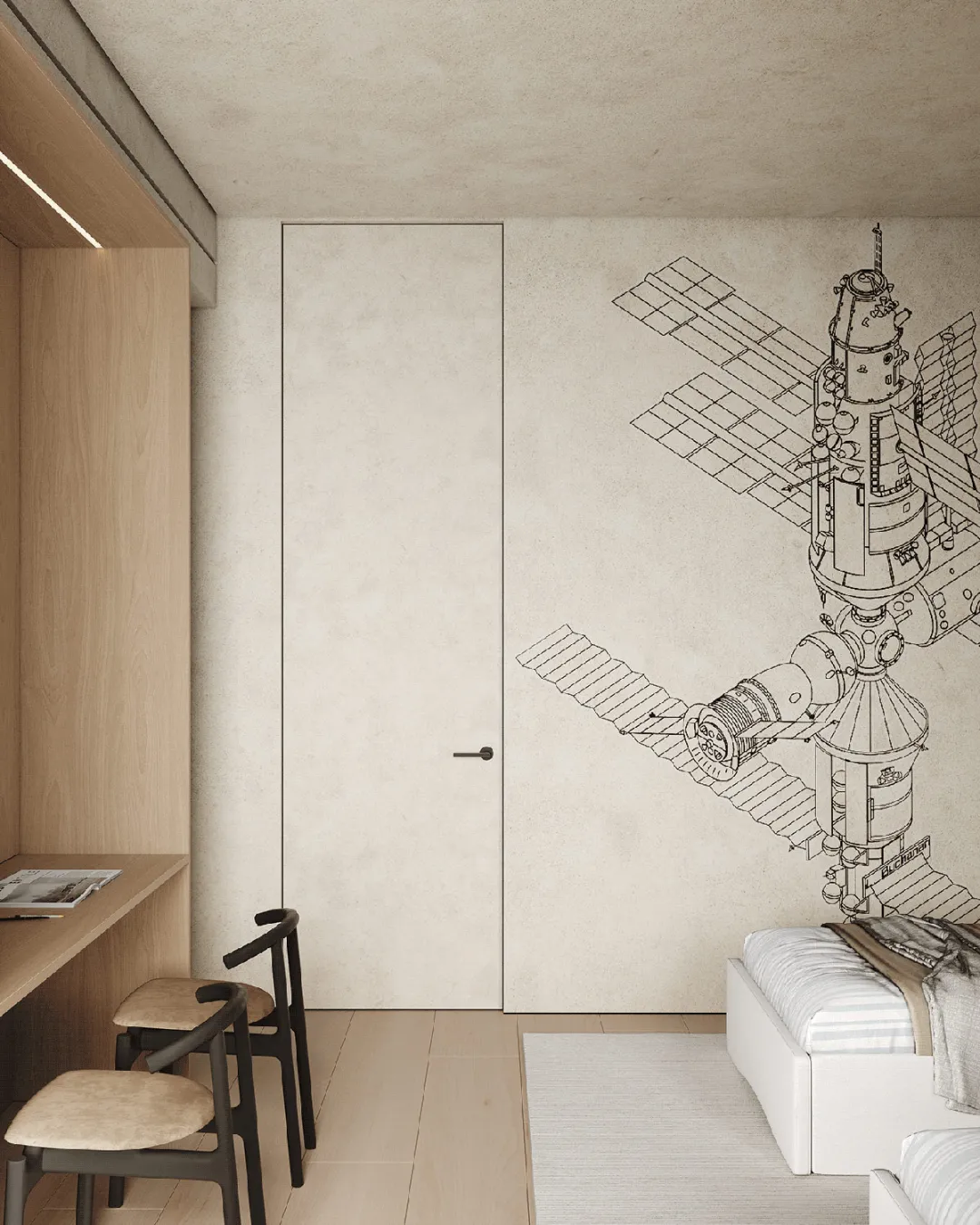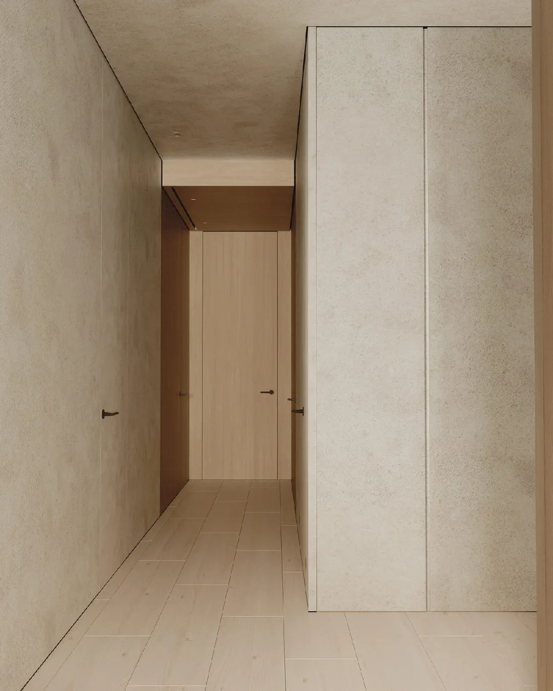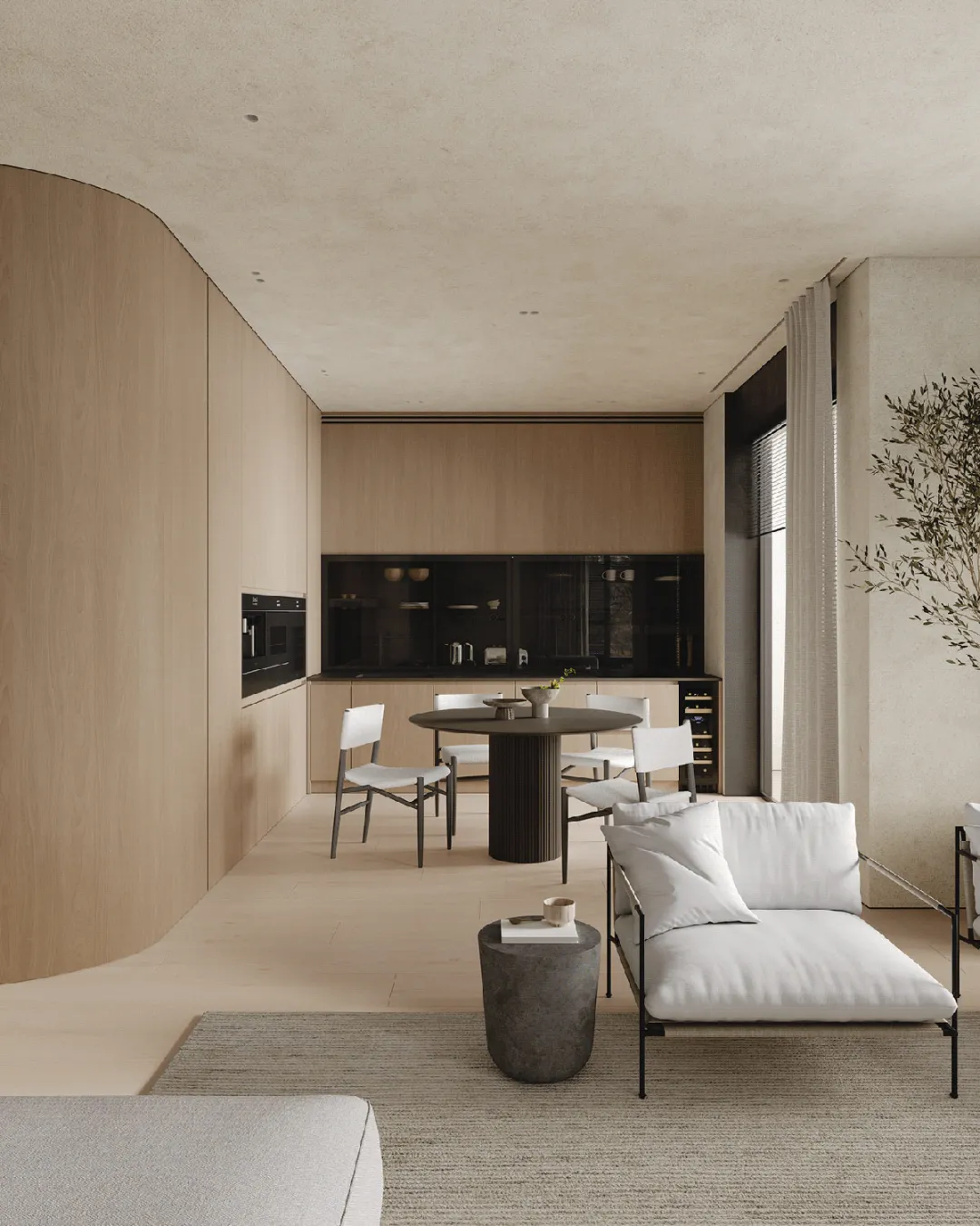 开放式的室内空间色彩柔软,光线充足,黑色元素的点缀为中性环境增添深度和光泽。客厅采用围合式布局,严谨中透着轻松与舒适;厨具和电器利用中段橱柜空间进行收纳设计;卧室延用客厅的设计格调;儿童卧室明亮、清新、时尚,配有定制的儿童书桌设计和装饰性搁架墙;亲子房是孩子们休息的地方,拥有自己安静的工作空间;浴室灵感来自现代梳妆台和大胆对比的黑色装置。