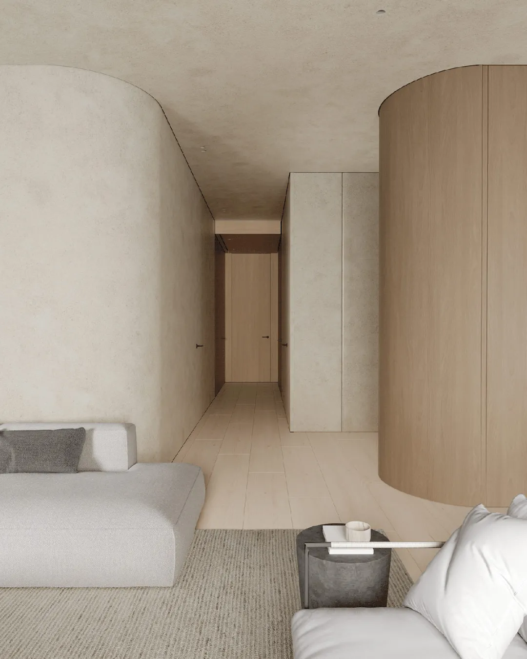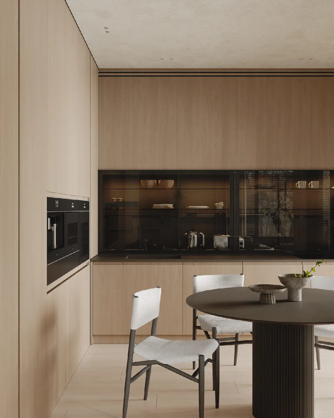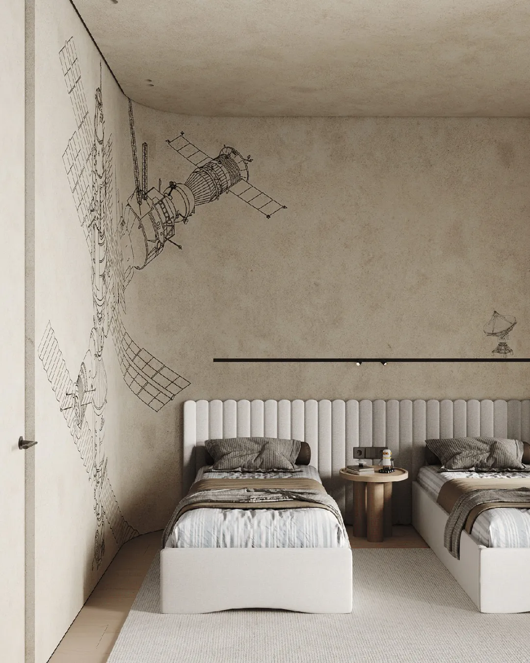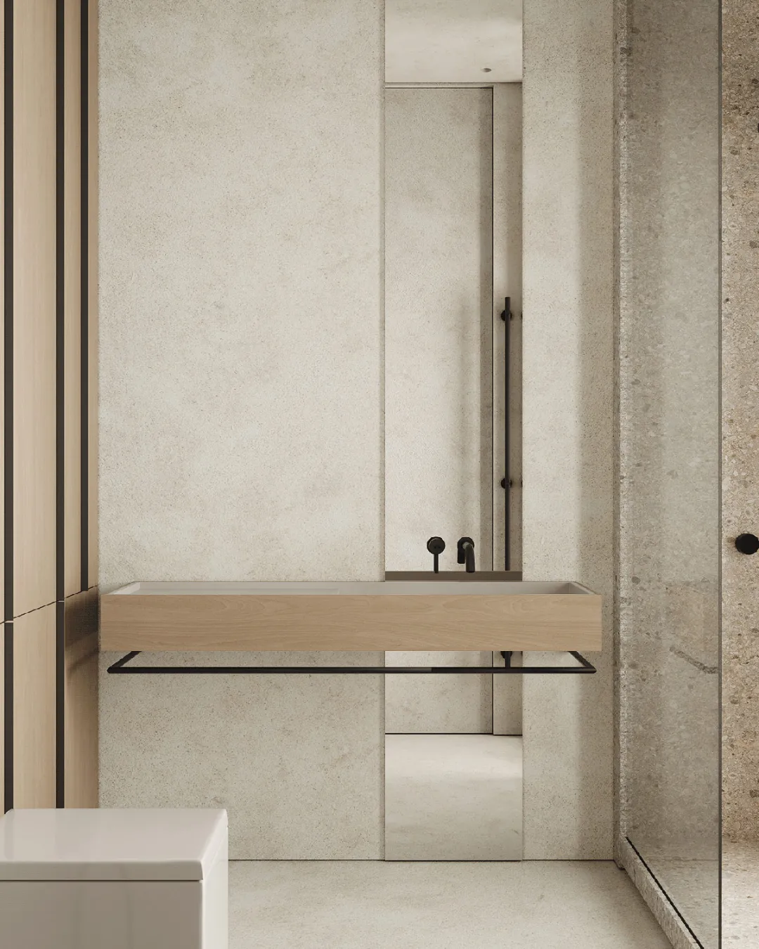 开放式的室内空间色彩柔软,光线充足,黑色元素的点缀为中性环境增添深度和光泽。客厅采用围合式布局,严谨中透着轻松与舒适;厨具和电器利用中段橱柜空间进行收纳设计;卧室延用客厅的设计格调;儿童卧室明亮、清新、时尚,配有定制的儿童书桌设计和装饰性搁架墙;亲子房是孩子们休息的地方,拥有自己安静的工作空间;浴室灵感来自现代梳妆台和大胆对比的黑色装置。