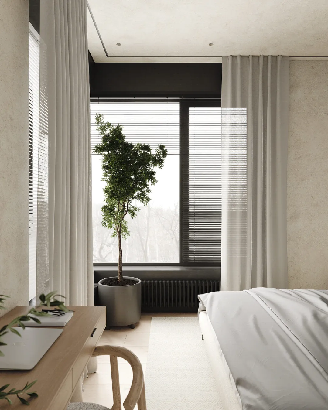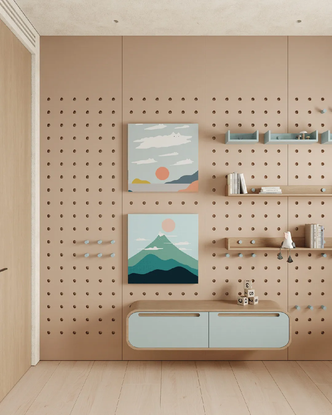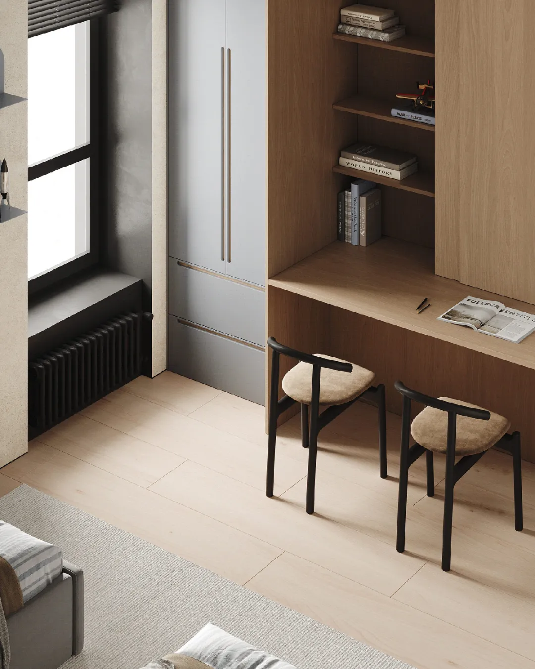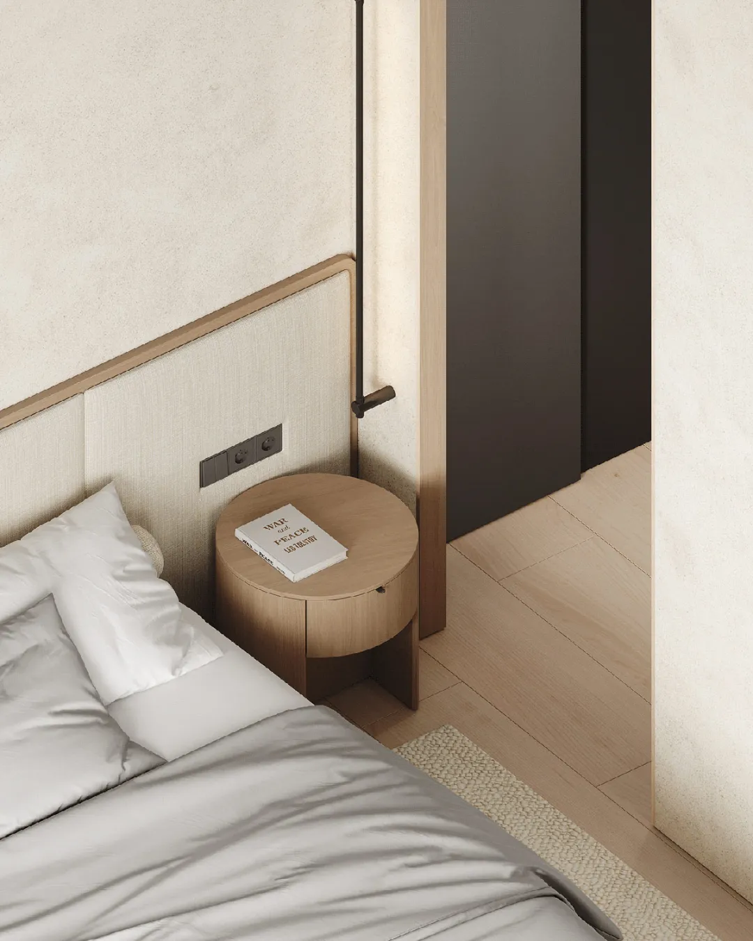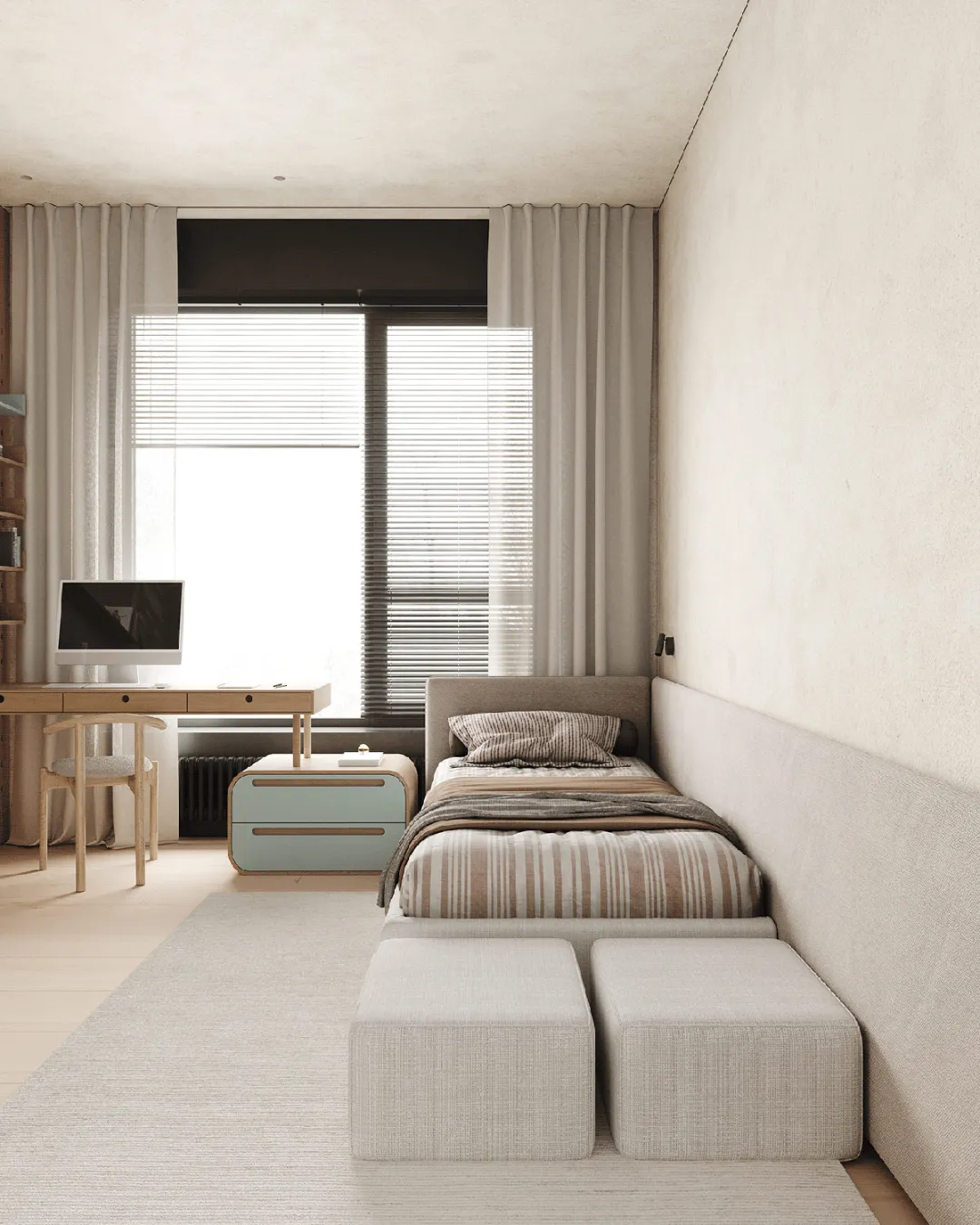 开放式的室内空间色彩柔软,光线充足,黑色元素的点缀为中性环境增添深度和光泽。客厅采用围合式布局,严谨中透着轻松与舒适;厨具和电器利用中段橱柜空间进行收纳设计;卧室延用客厅的设计格调;儿童卧室明亮、清新、时尚,配有定制的儿童书桌设计和装饰性搁架墙;亲子房是孩子们休息的地方,拥有自己安静的工作空间;浴室灵感来自现代梳妆台和大胆对比的黑色装置。