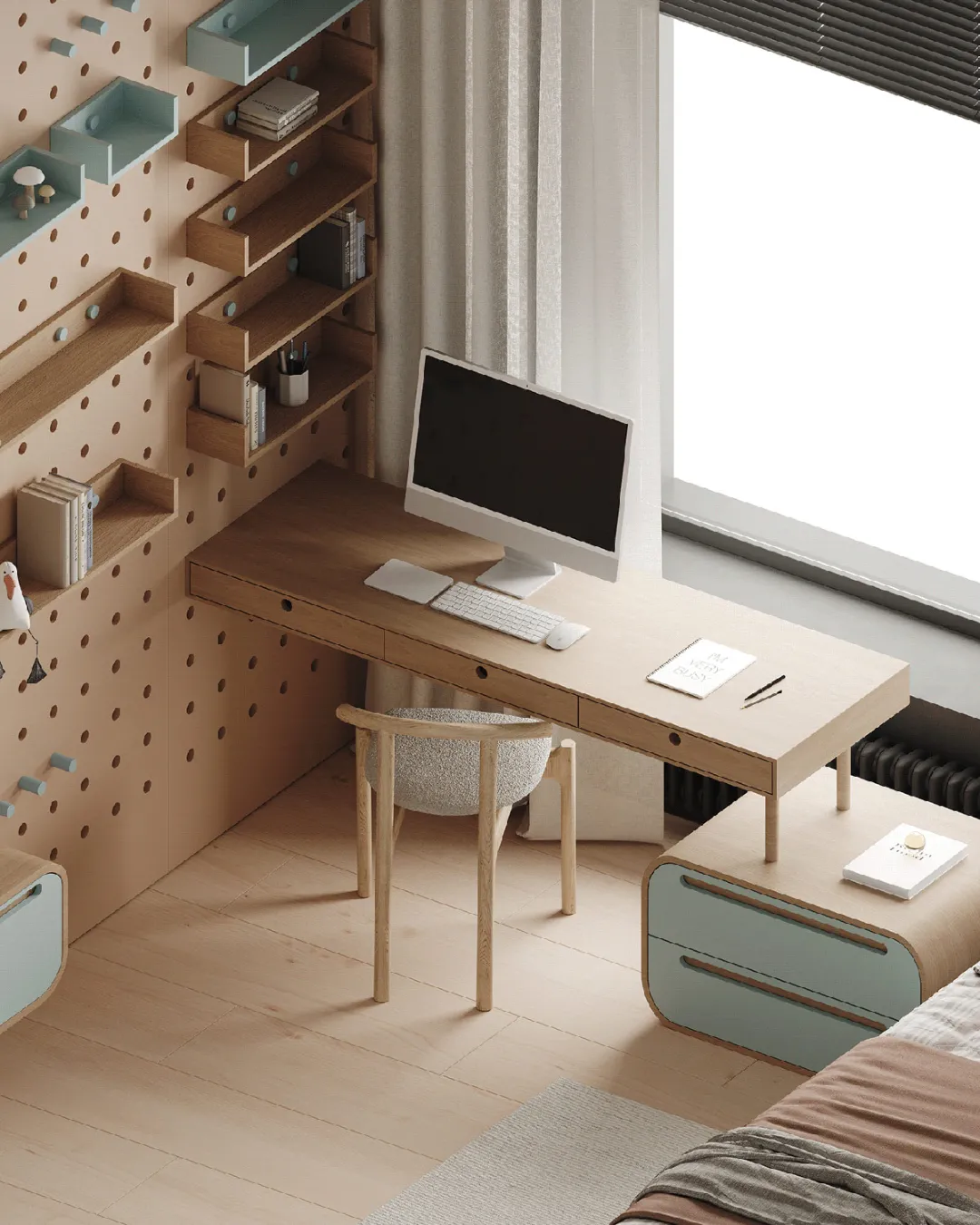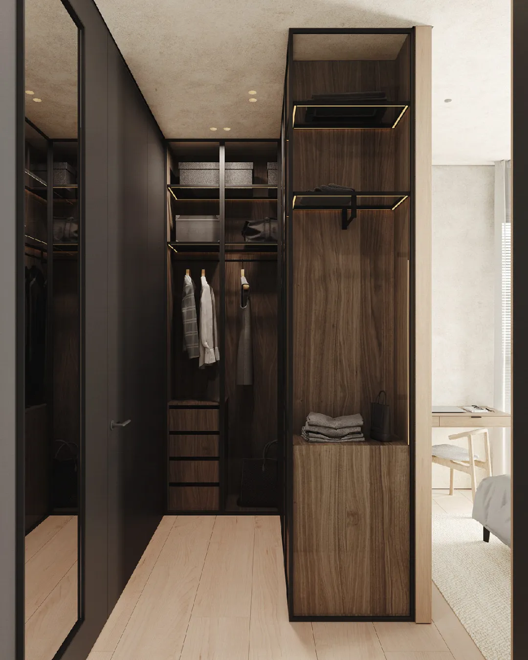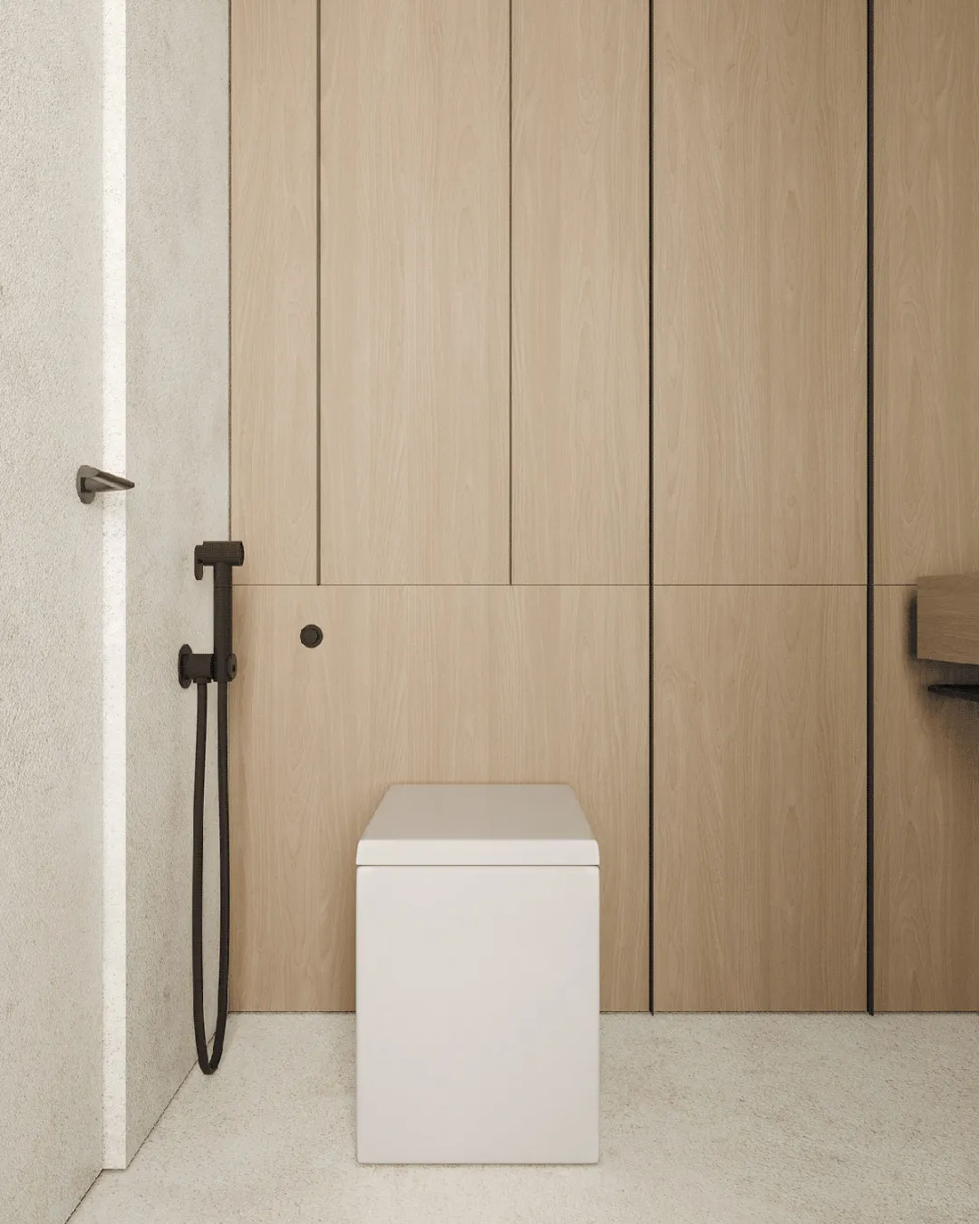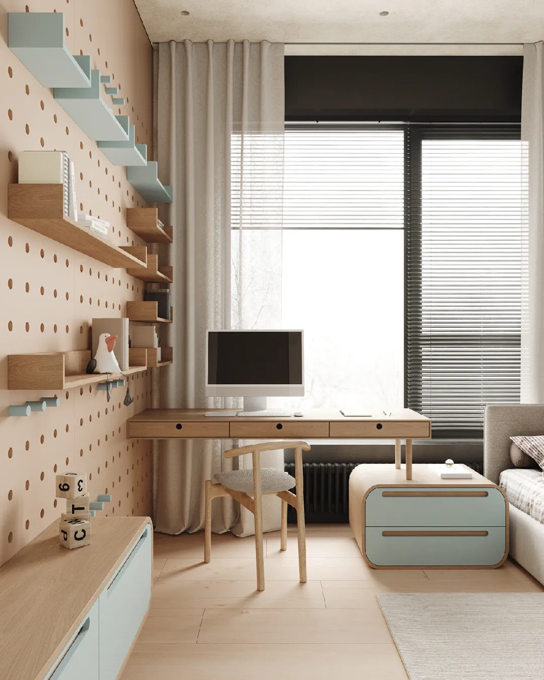 开放式的室内空间色彩柔软,光线充足,黑色元素的点缀为中性环境增添深度和光泽。客厅采用围合式布局,严谨中透着轻松与舒适;厨具和电器利用中段橱柜空间进行收纳设计;卧室延用客厅的设计格调;儿童卧室明亮、清新、时尚,配有定制的儿童书桌设计和装饰性搁架墙;亲子房是孩子们休息的地方,拥有自己安静的工作空间;浴室灵感来自现代梳妆台和大胆对比的黑色装置。