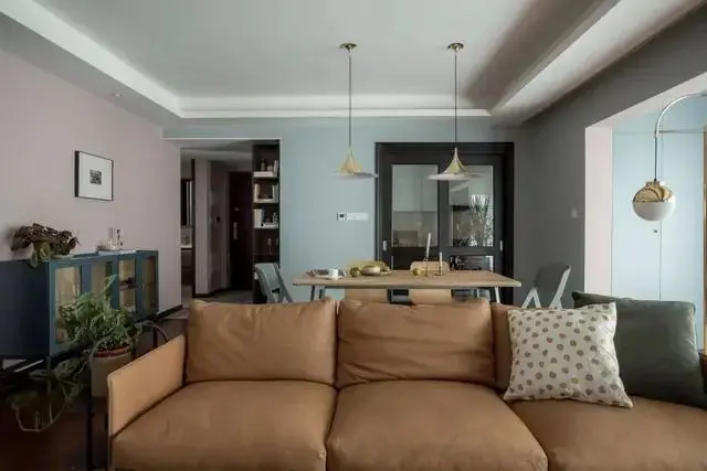 整个空间采用柔美的脏粉,与绿色、灰色、蓝色与金色巧妙地融合在一起,打造出丰富的色彩层次与多姿明朗的视觉观感。客餐厅以沙发做为分隔,横厅的布局,采光更好,动线也更加流畅。棕色的皮质沙发,舒适且有一种怀旧的质感。