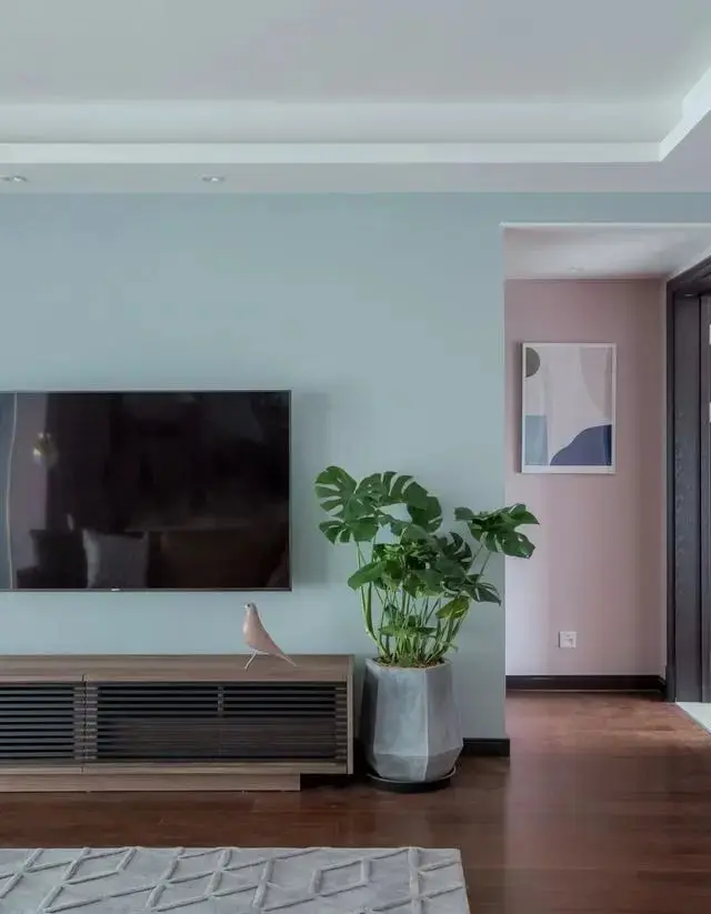 淡淡的蓝色电视背景,搭配木质电视柜,加上绿植的陪衬,格外的自然清新。从这个角度可以看到通往房间的过道,粉色与蓝色一近一远,清新唯美。