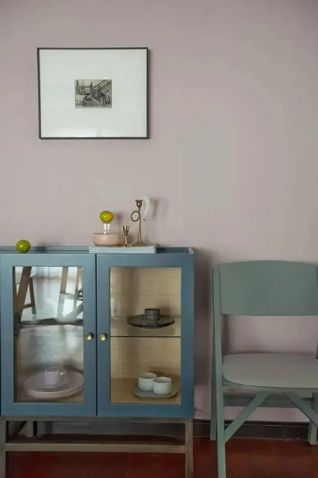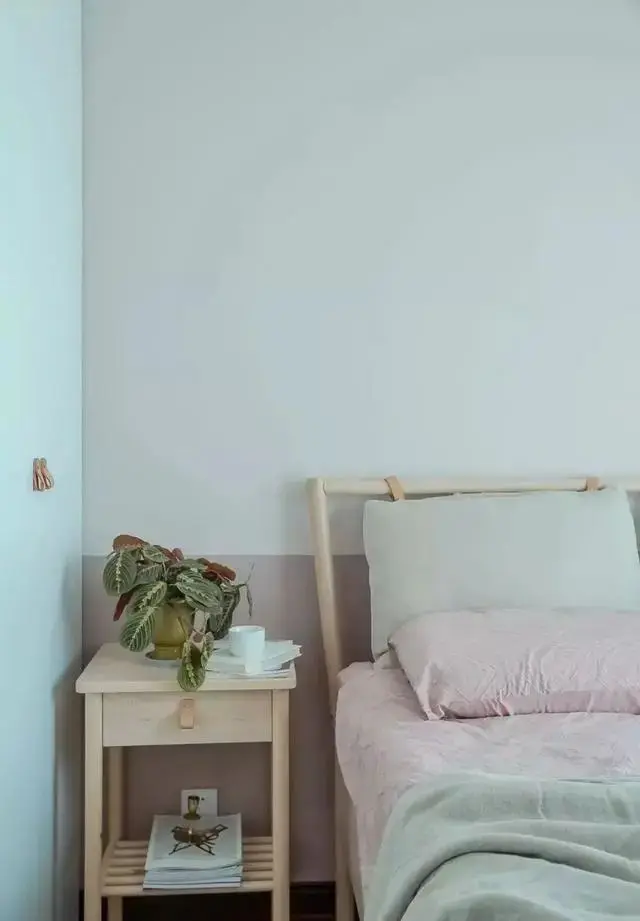 脏粉色的墙裙,床上用品,还有淡蓝色的衣柜柜门,这也是公共区域的调性,柔美清新。