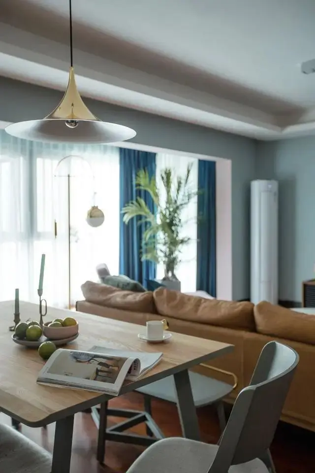 餐桌的白蜡木,有着自然的纹理,手感质地温润,这里除了用餐,也可以是阅读、喝茶的地方。灰蓝色的窗帘与家具相呼应,让空间的配色更加和谐统一。