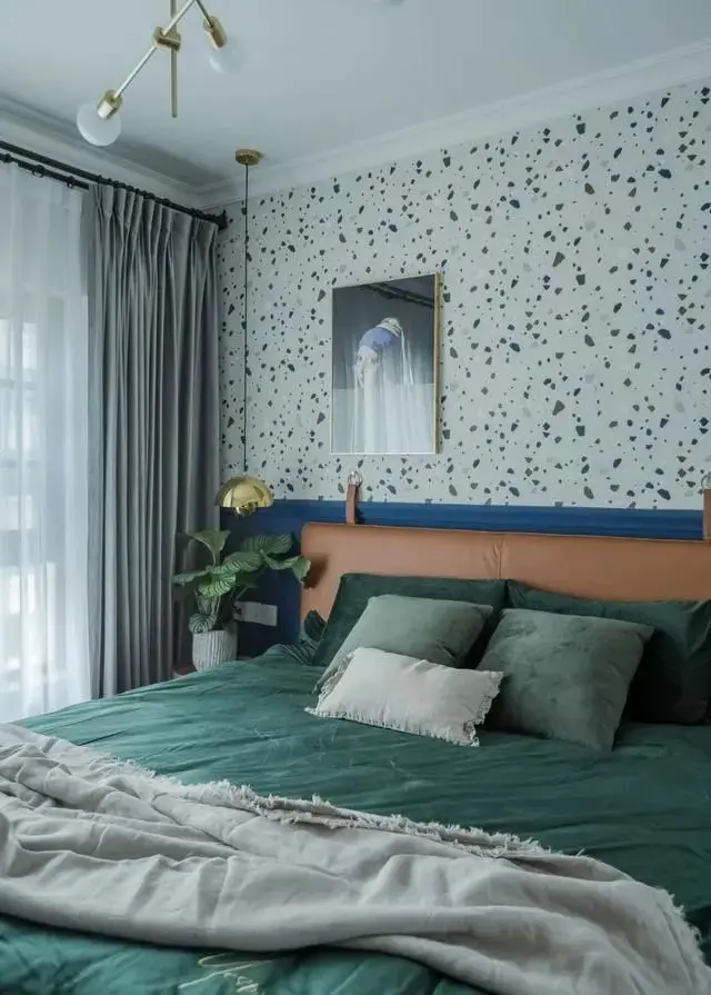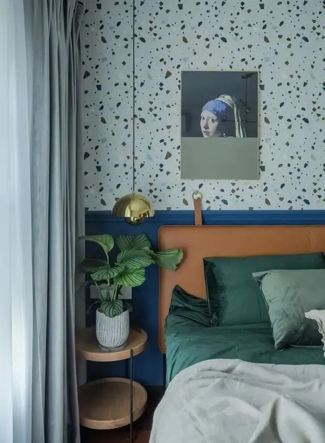 搭配同样色彩的墙纸,水磨石状的色彩斑点有如画家随性的笔触,并辅以绿植盆栽营造轻松、舒适的空间氛围。