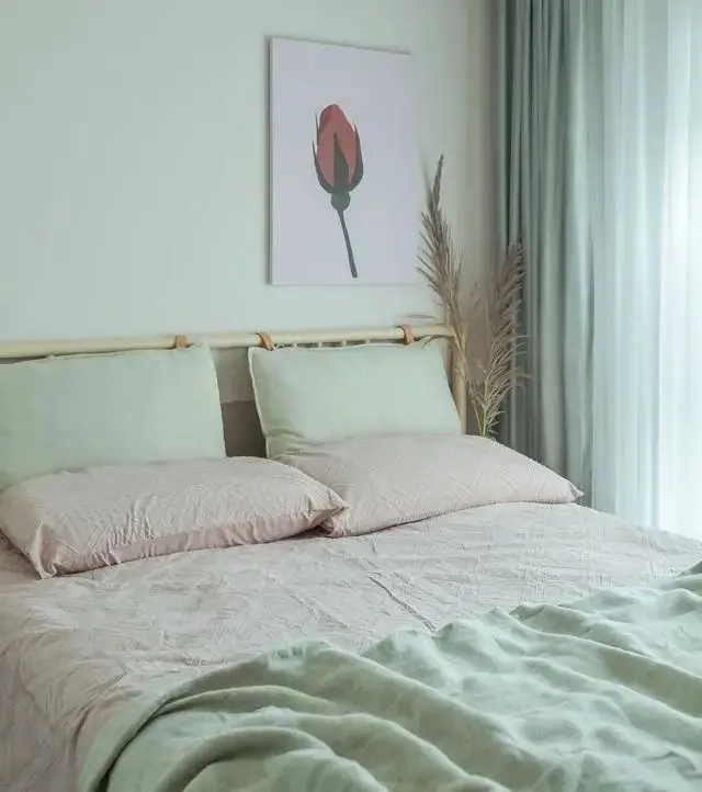 主卧延续的公共区域淡雅柔和的调调,通过装饰画选装软装增添空间的艺术的情调。