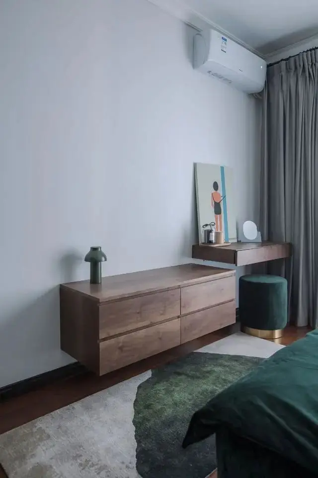 利用床尾的宽度设计了梳妆台,同时又加入一组挂壁抽屉,增强空间的收纳性,又便于打理,柜体选用了胡桃木材质,搭配墨绿色空间散发出一丝复古气息。