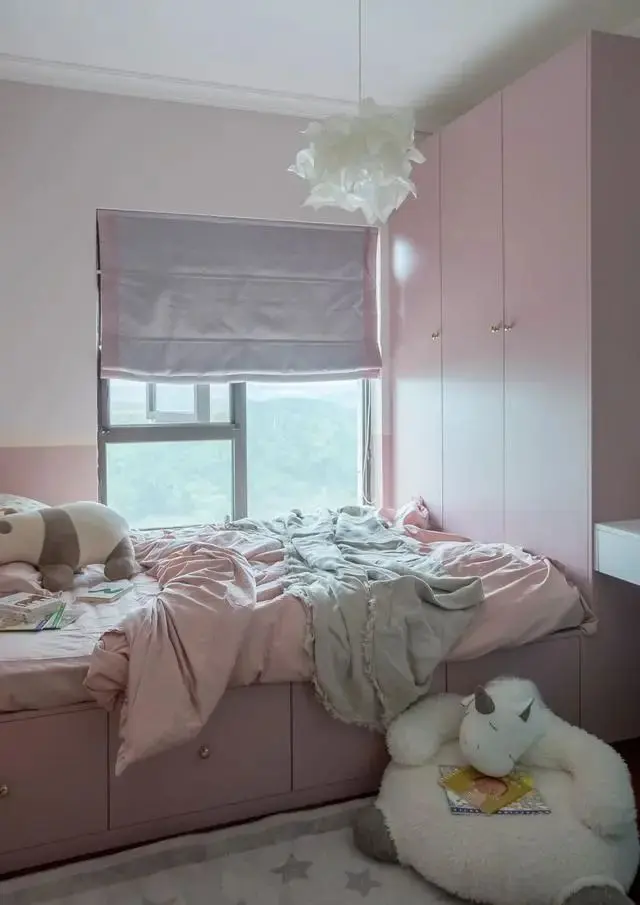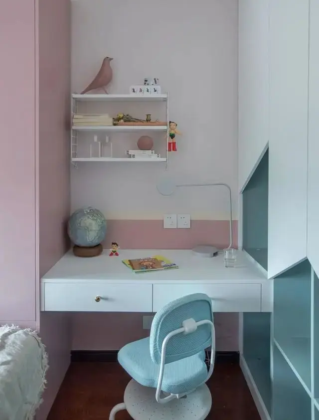 粉色与蓝色的大量使用,还有收纳柜独特的造型,打造了一个唯美而充满童趣的儿童成长空间。