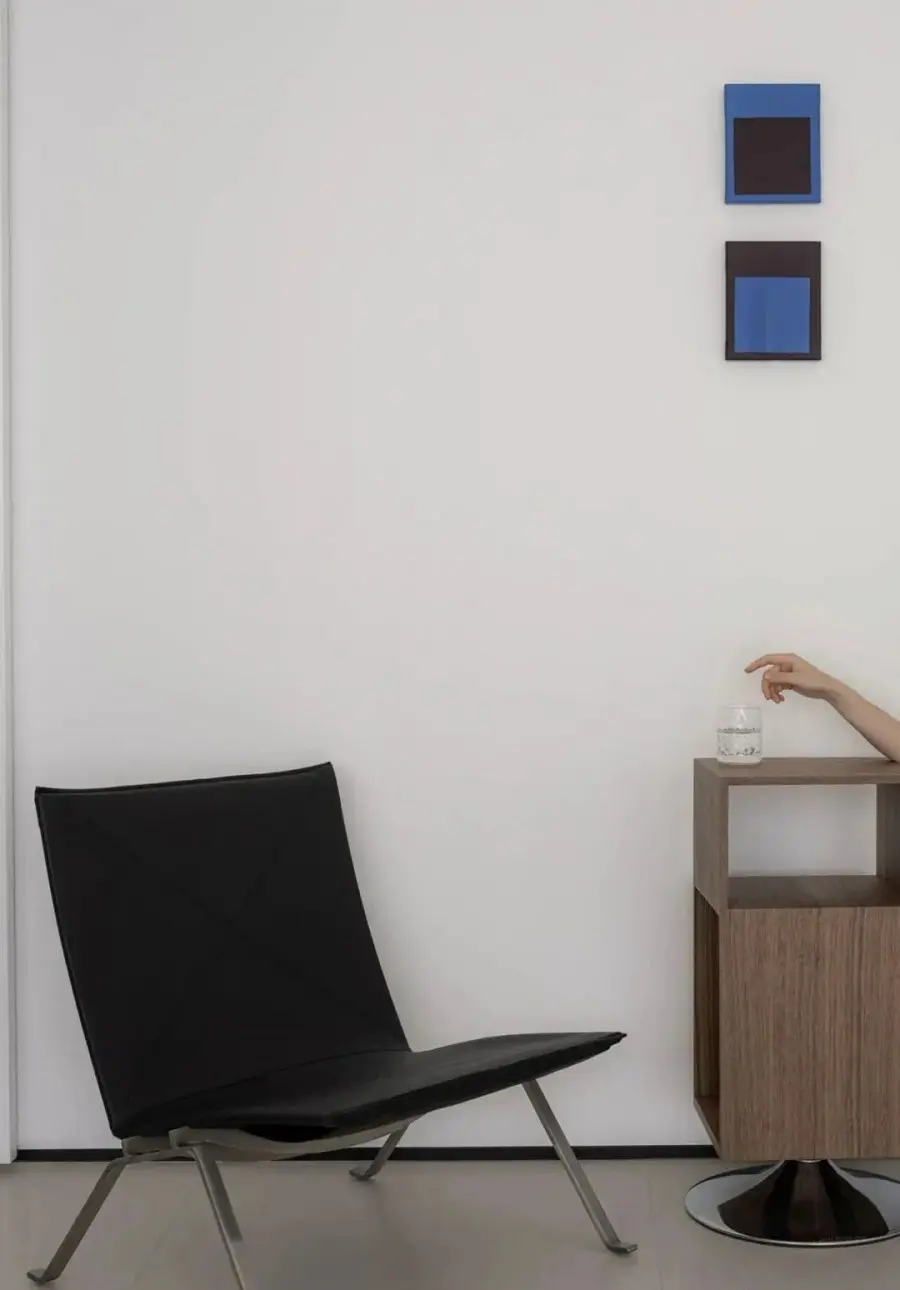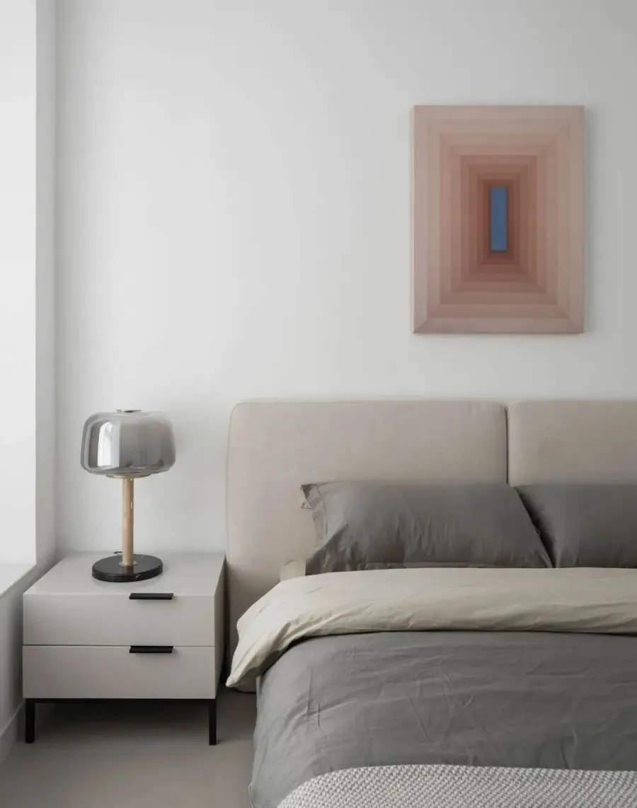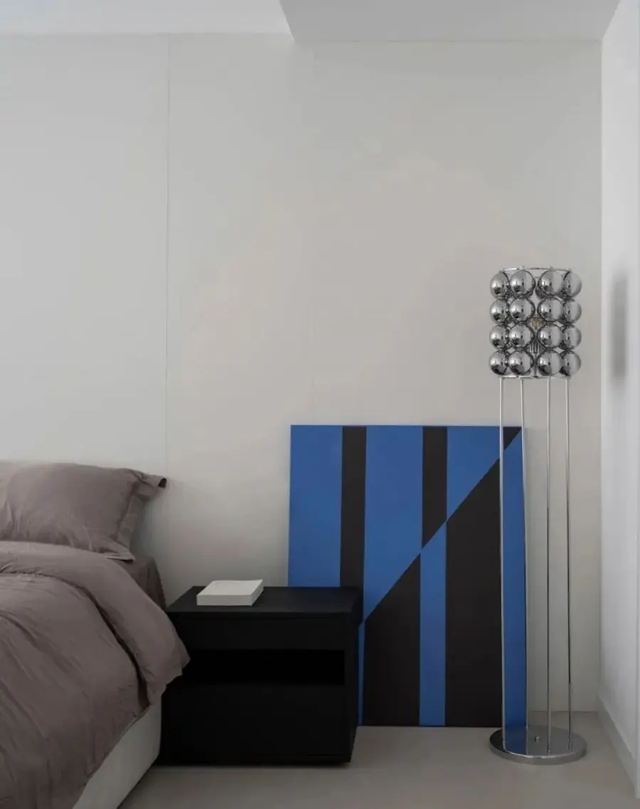 ▲ 另一侧布置床头柜和装饰画,克莱因蓝与黑色穿插,色块堆叠出的图形,极具建筑设计感,隐示屋主从事的行业