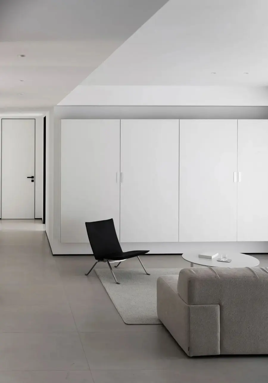 ▲ 左侧设置块面化白色鞋柜,极简、悬浮,如包豪斯特有的简洁干练的结构,也与整体纯粹的空间氛围相吻合,在空间里突出鞋柜的瞩目感