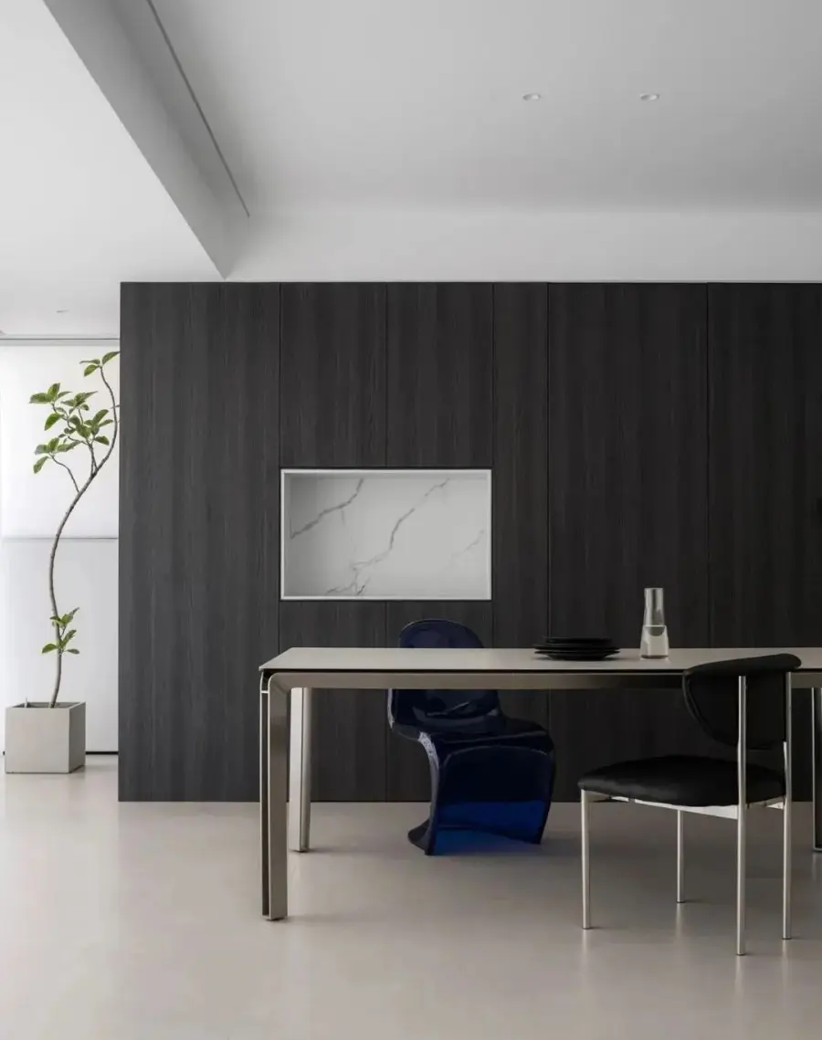 ▲ 餐厅同样采用极简的设计手法,钢骨架的餐桌结构,在表面覆盖浅色的岩板