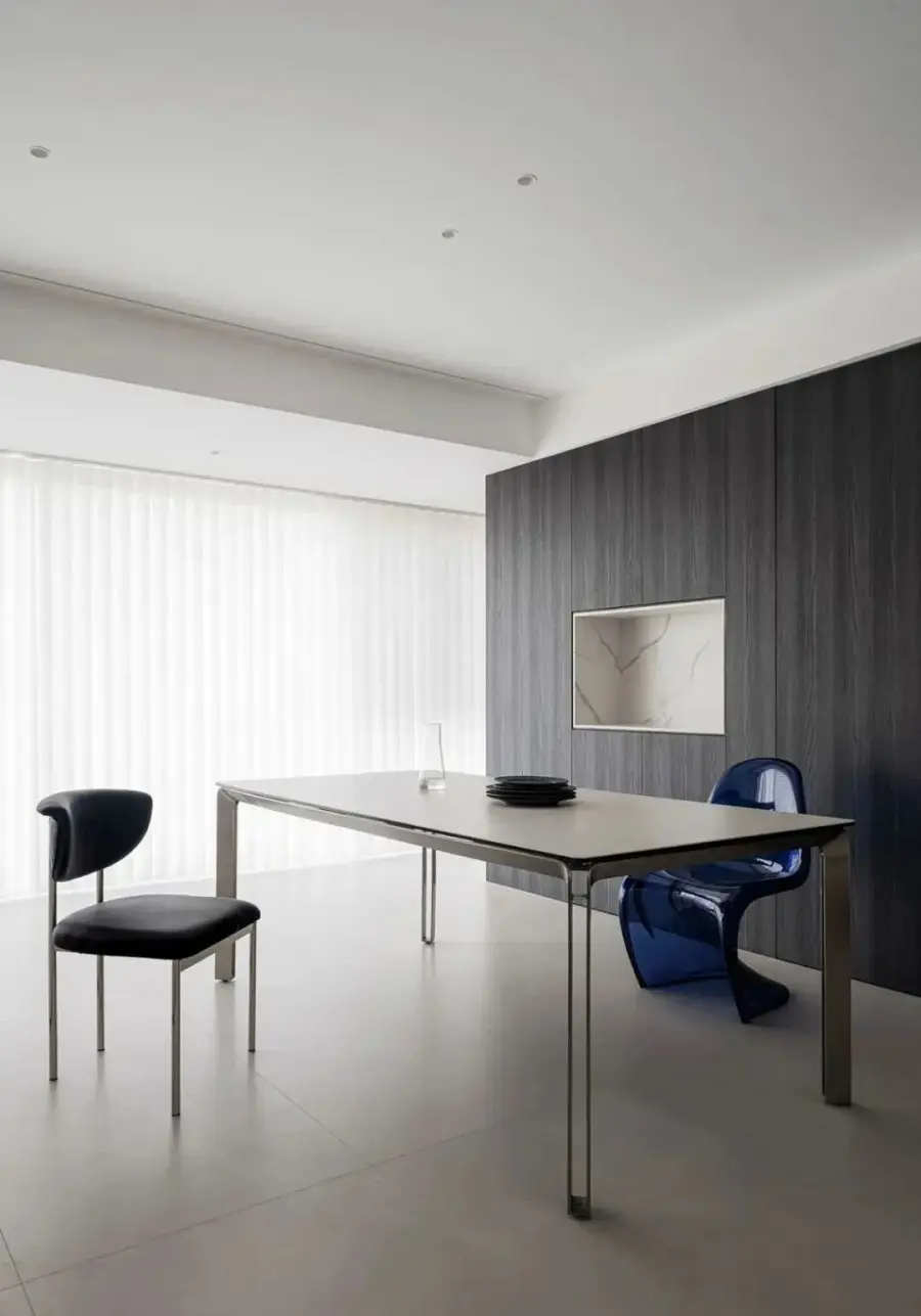 ▲ 克莱因蓝的亚克力餐椅,成为空间的点睛色彩,为冷静的空间注入灵魂,兼顾空间的艺术性与功能性