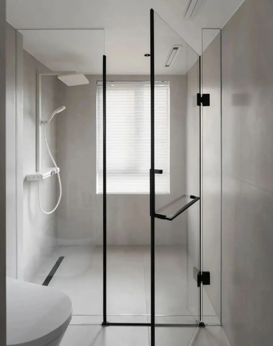 ▲ 次卫同样延续黑白色调,依次布局洗漱区、马桶区和淋浴区
