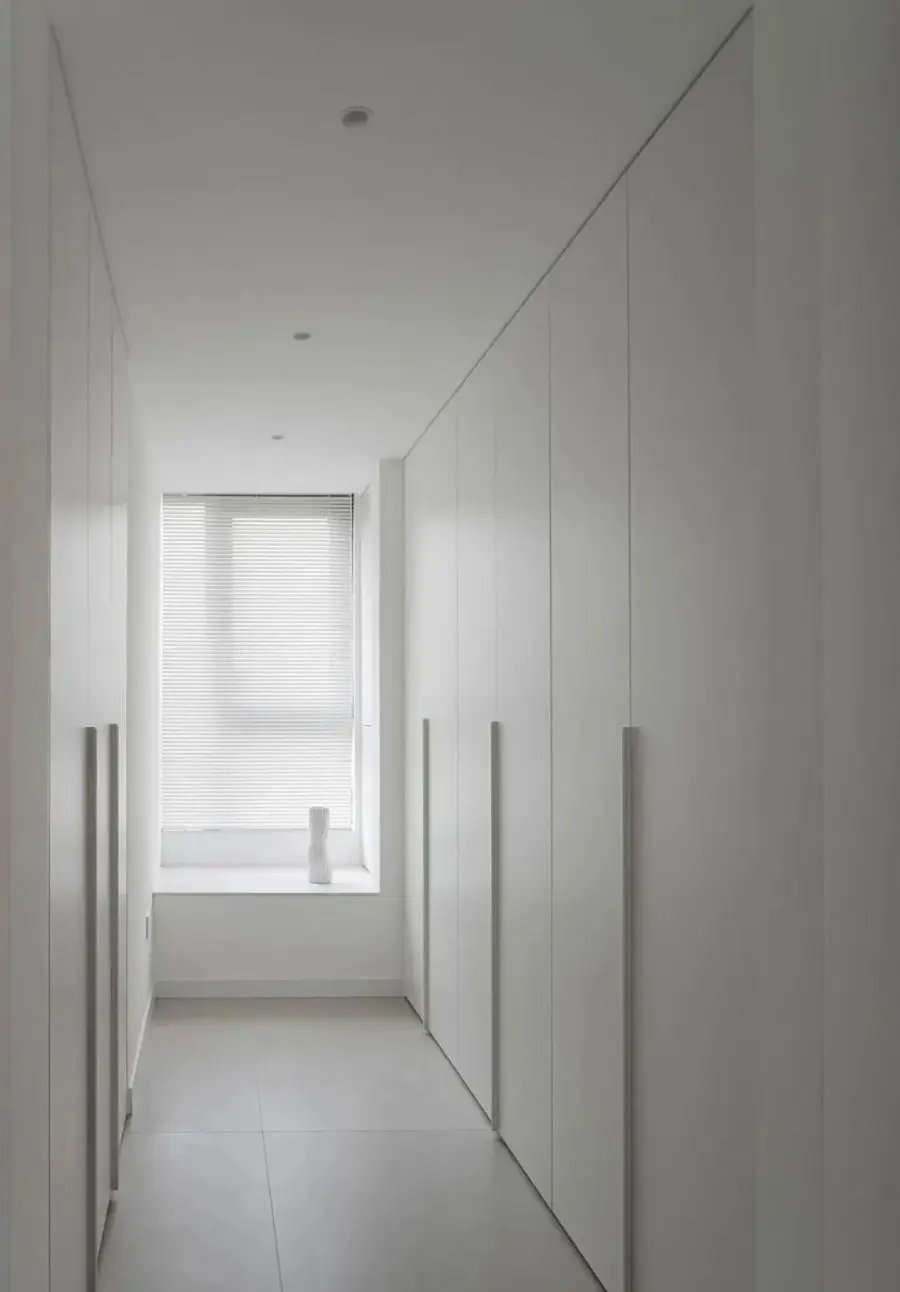 ▲ 步入式衣帽间,两边是顶天地立大衣柜,整个空间都是白色,视觉整洁清爽