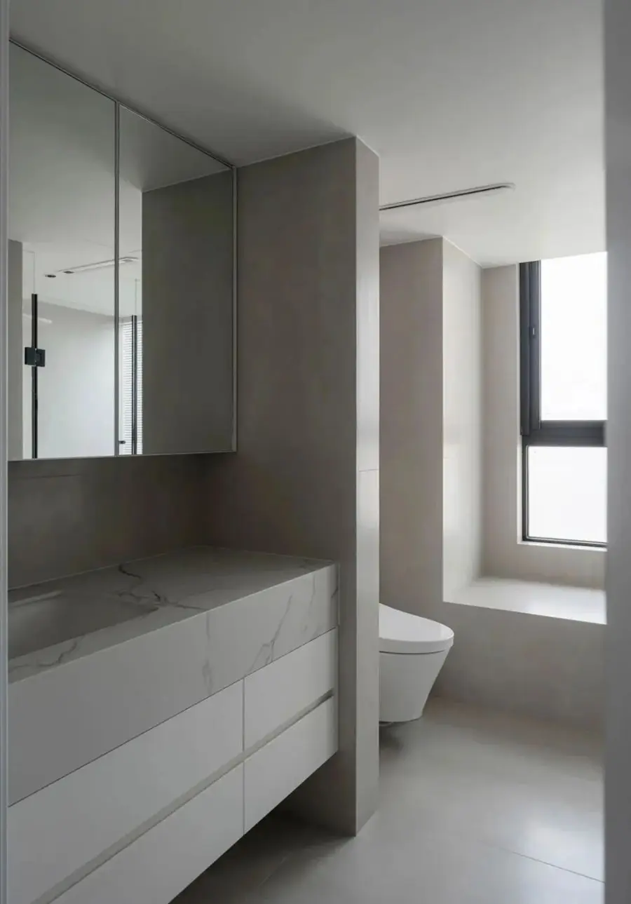 ▲ 主卫浴室柜和马桶均做悬空设计,便于清洁,马桶区布置淋浴区