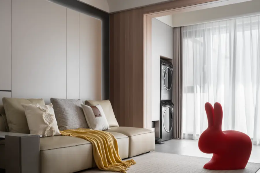▲ 取消传统茶几的布置腾出更多活动区,红色兔子卡通椅俏皮可爱
