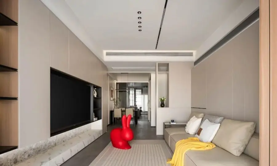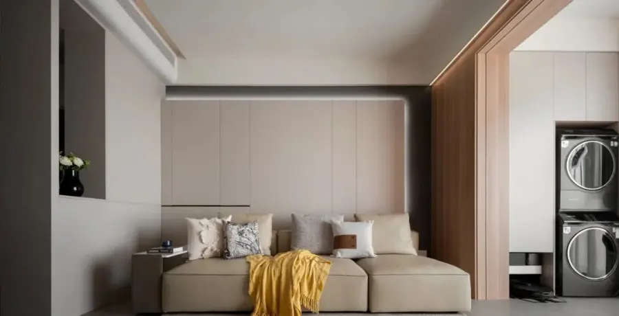 ▲ 客厅纳入一半阳台,扩大使用面积与采光,空间运用米色、木色、灰色相结合,加入暖光灯带和点光源,整体显得温暖柔和