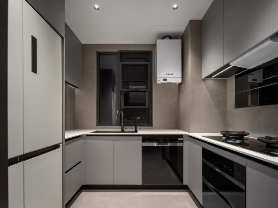 ▲ 厨房U型布局,操作动线流畅,灰色调的橱柜与墙地砖搭配,耐脏富有质感