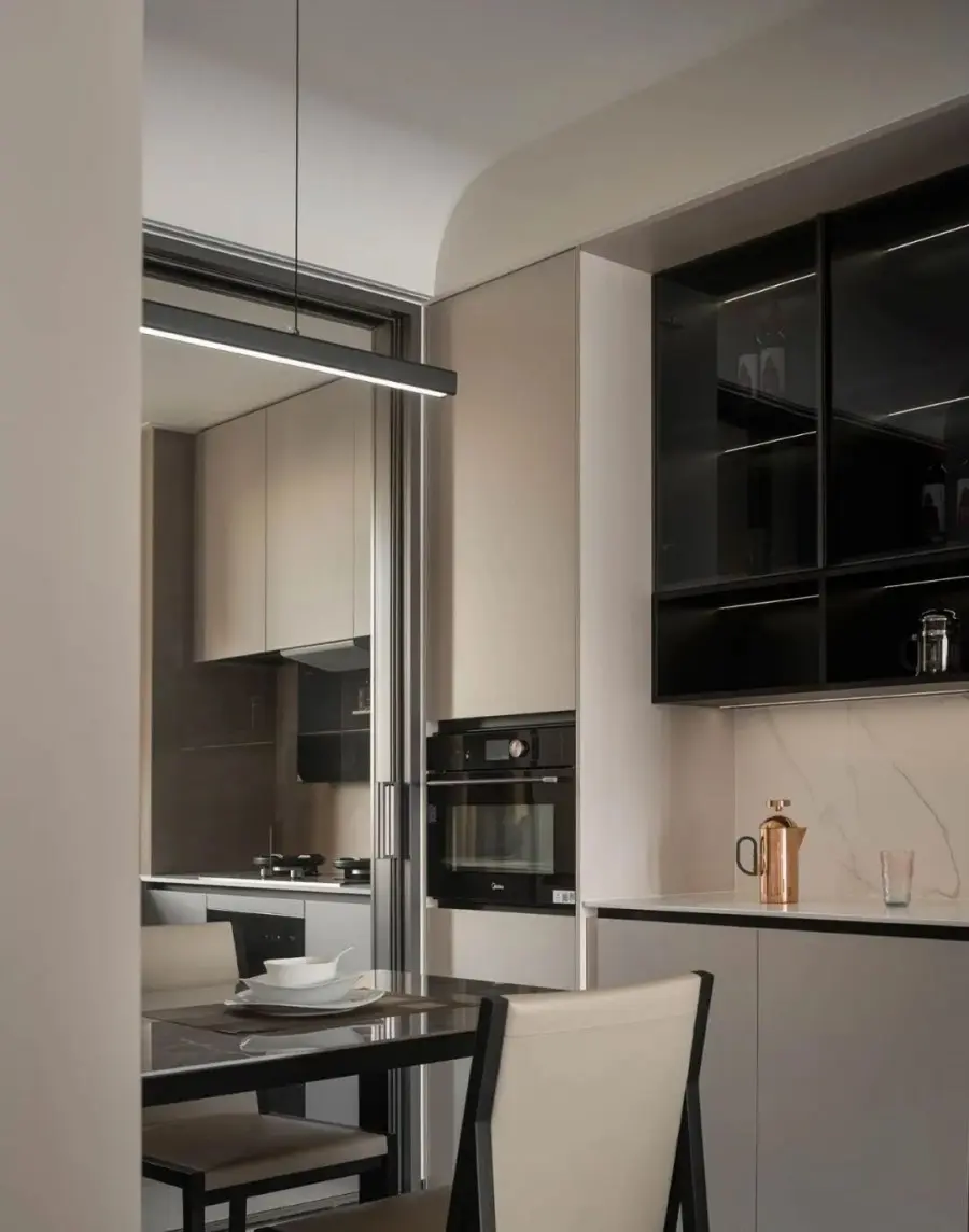 ▲ 餐厅,现代餐桌椅搭配一字型吊灯,沿墙定制餐边柜兼西厨操作台功能
