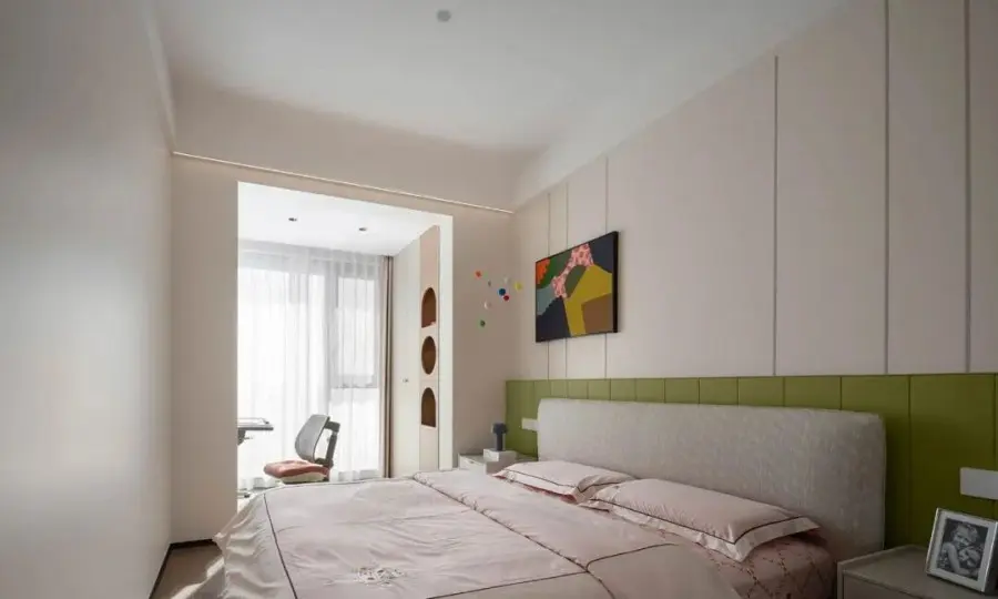 ▲ 儿童房纳入另一半阳台,作为孩子的学习区,绿色半高护墙象征着希望与生机