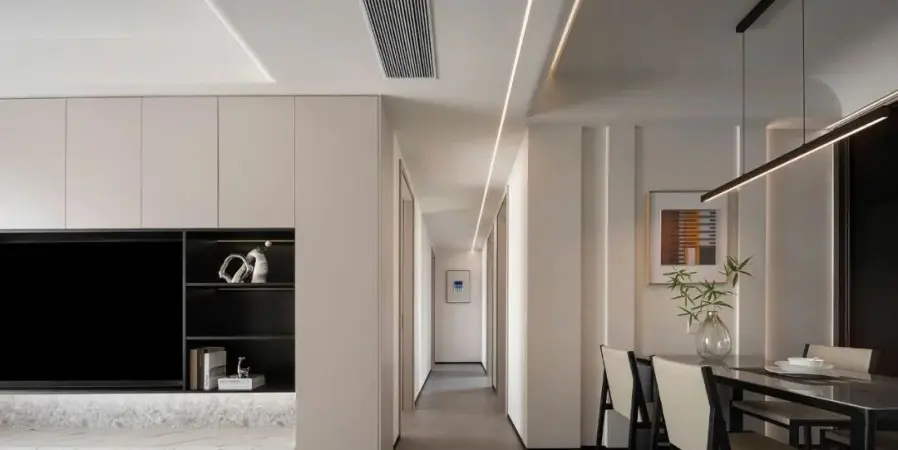 ▲ 顶面的线性灯从玄关延伸至走廊,起到动线引导的作用