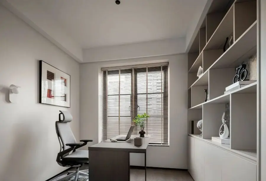 ▲ 书房陈设简单,背景做整排书架,上半部分做开放格用来放书籍和摆件,下半部分做封闭柜门,可用来收纳零碎物品