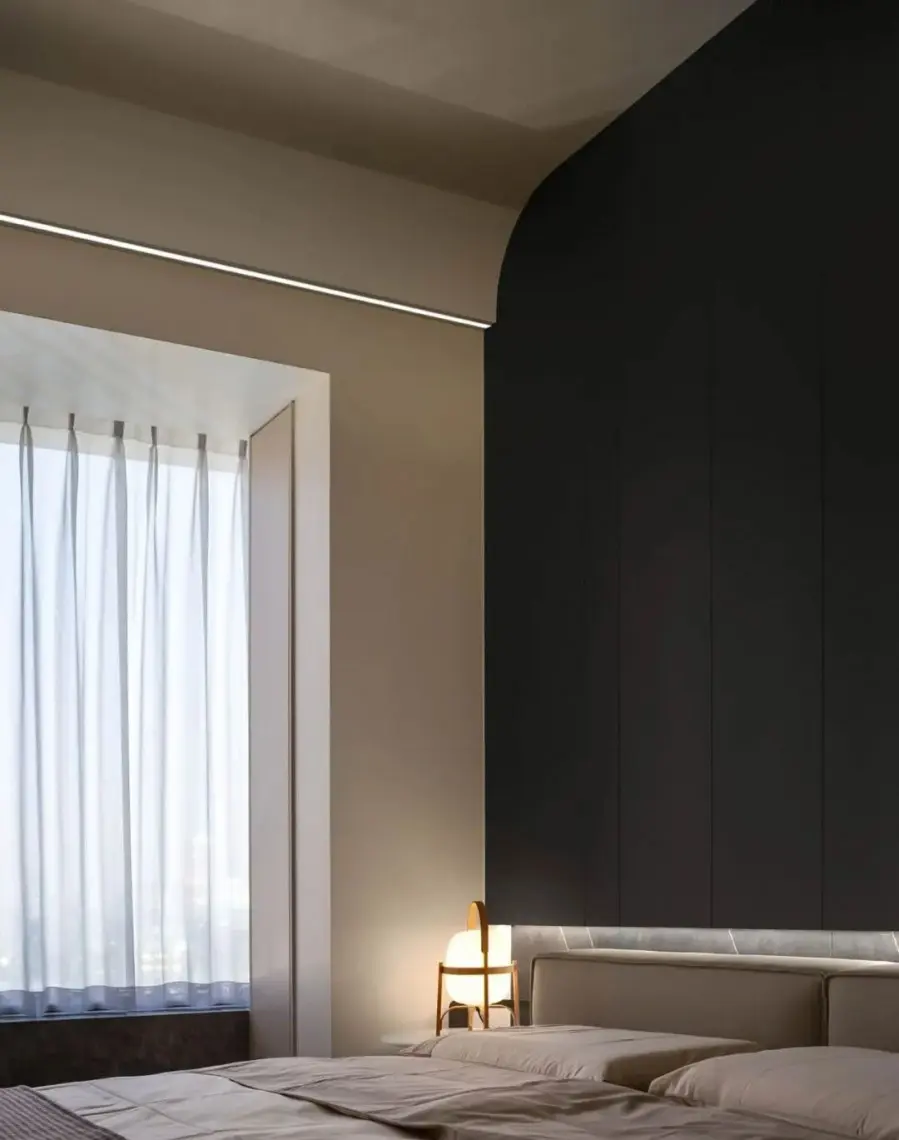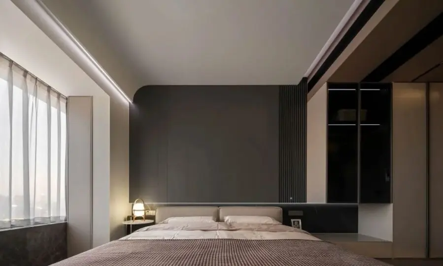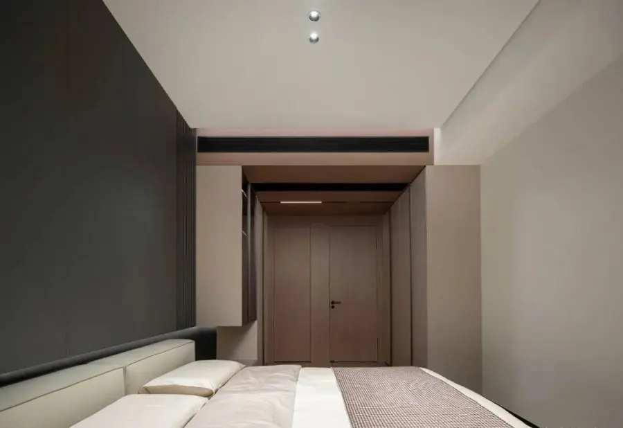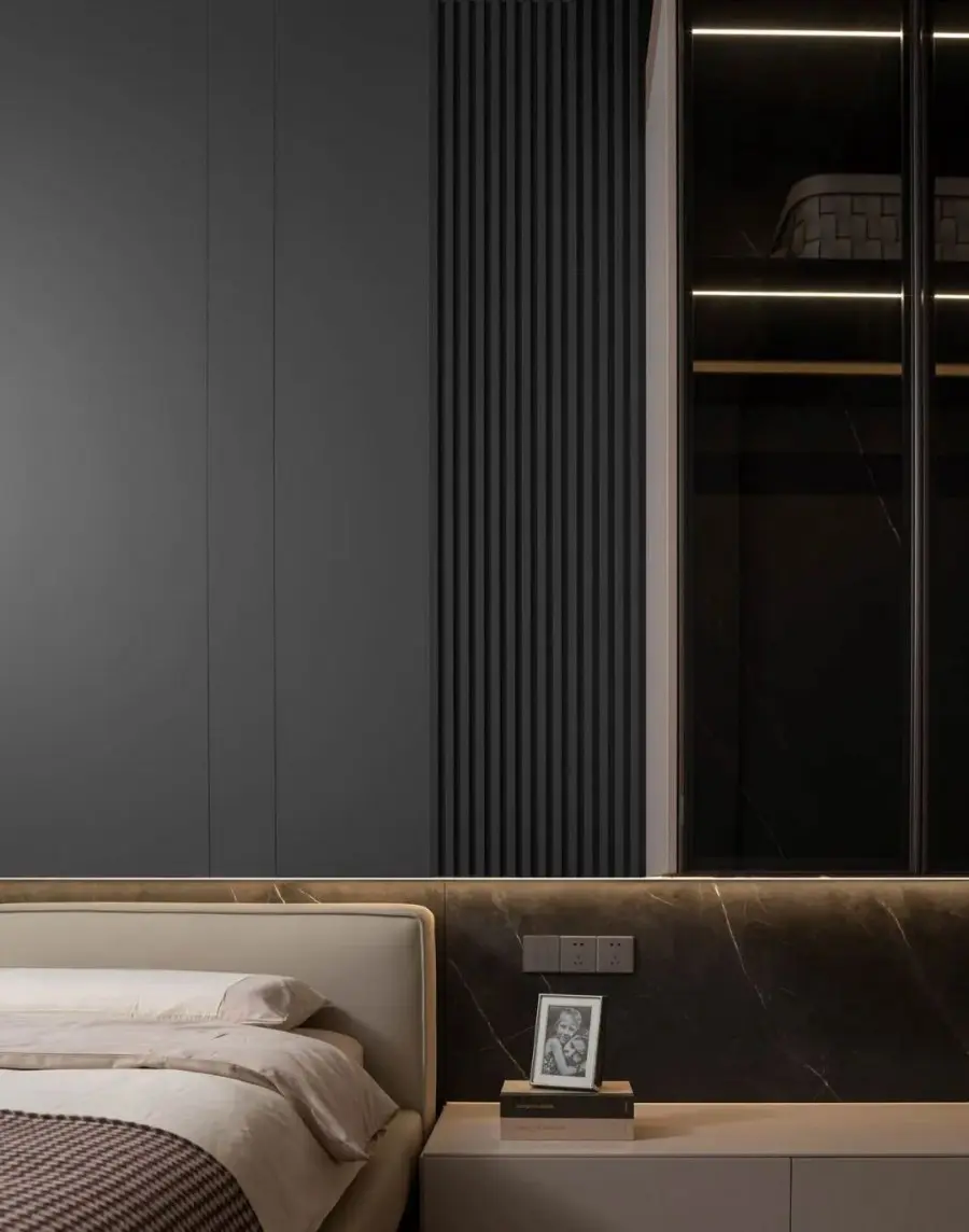 ▲ 主卧,黑白灰的空间加入木色与暖光源中和,营造出沉稳静谧的舒眠氛围