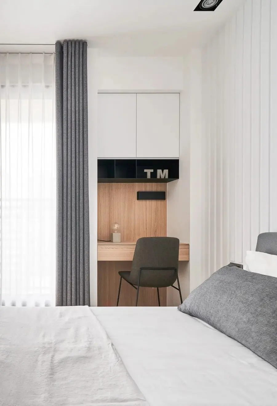 ▲卧室以简洁的无主灯空间基础,床头墙以硬包的背景质感,搭配床尾的木质感墙面定制柜,还有灰色的布艺床铺,也让卧室显得更加舒适自然。