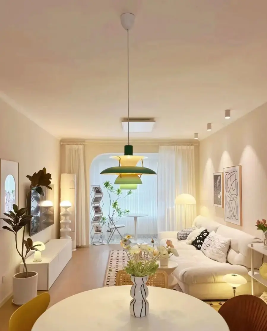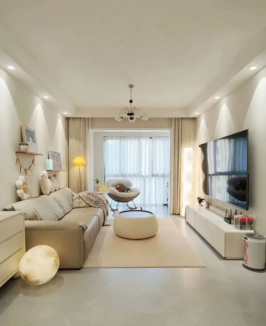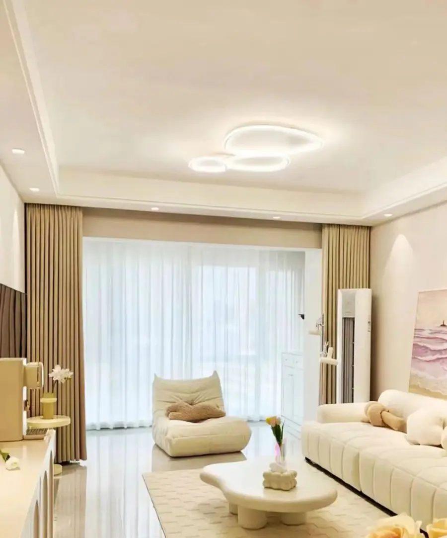 层高2.6米以下都行,因为层高有限或是旧房改造,无法吊顶也能搭配无主灯,经济实惠也好看;安装明装灯具,看上去简洁大方,同时视觉也更空旷!