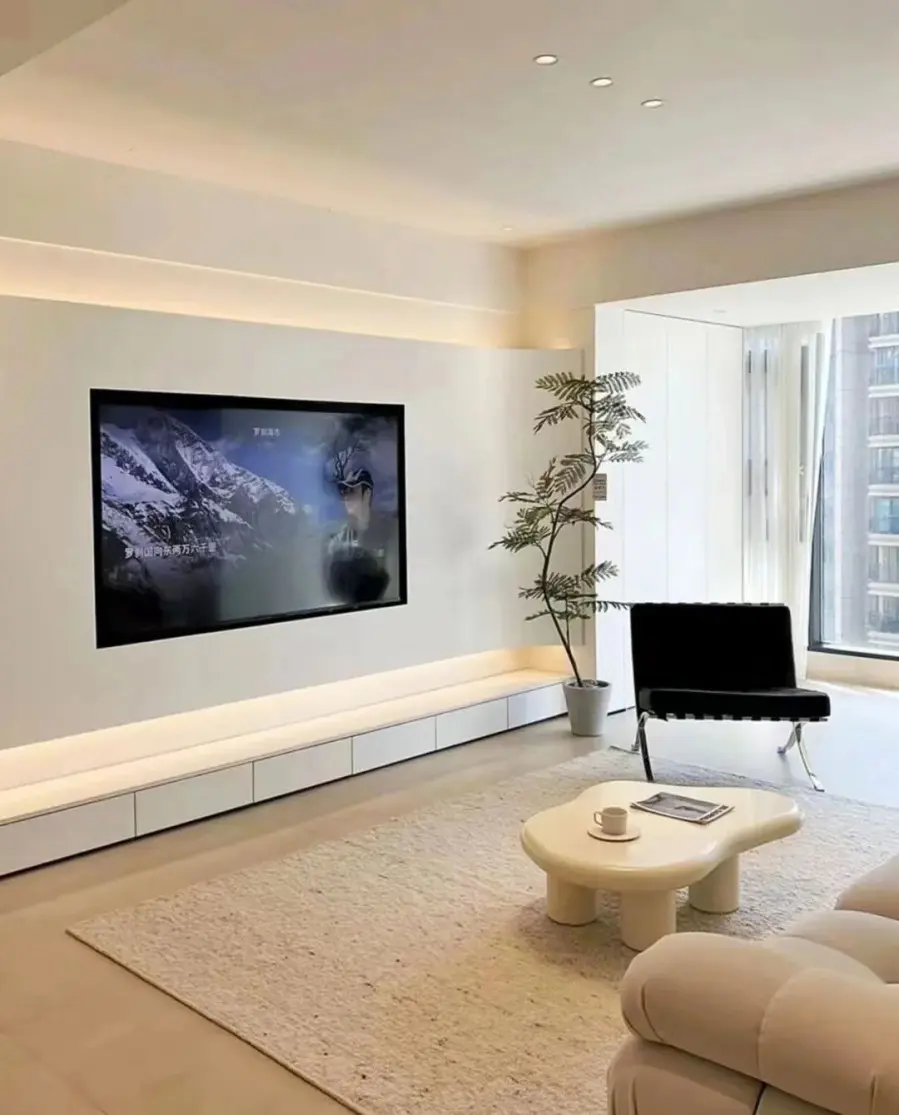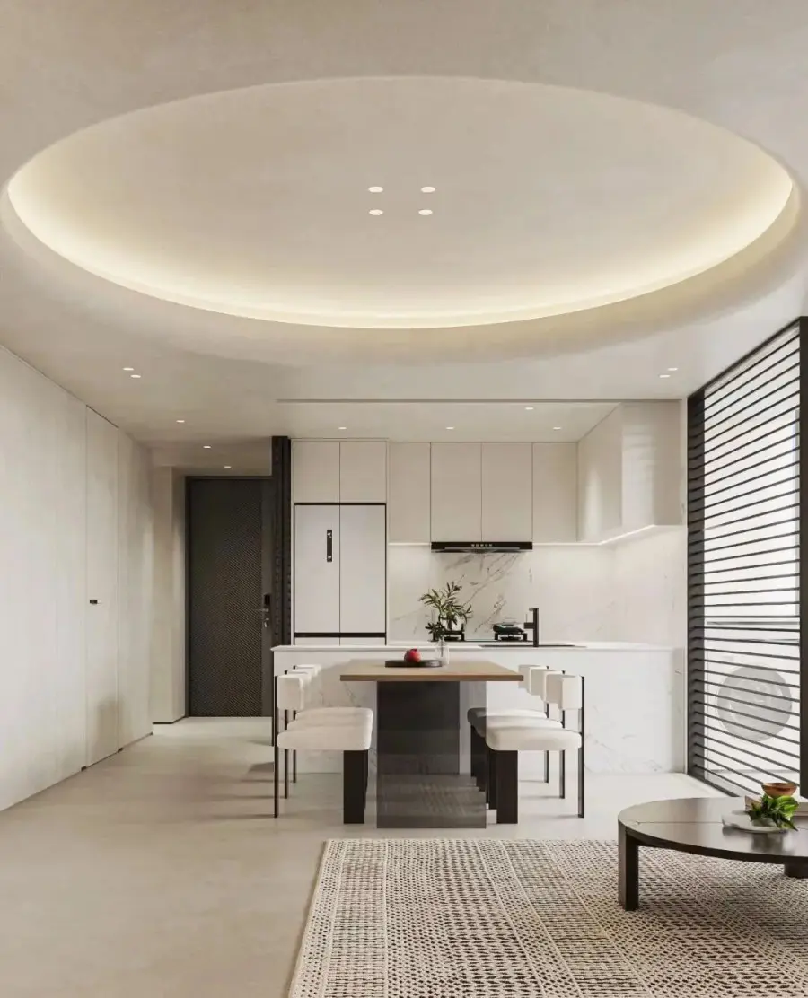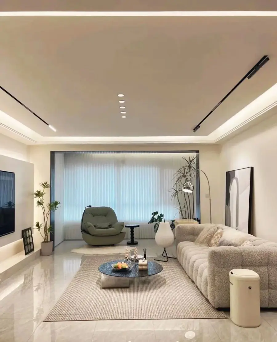 平面式吊顶无需任何造型和层次,大平顶结合无主灯设计是现在比较流行的一种做法,适合层高2.8米以上,楼层低会压抑,简约大气会让空间更空旷显大,但是价格高,出来的效果是真香!巧妙利用磁吸轨道、射灯等做装饰和光线提供,与简约、极简等风格更容易搭配,能让空间显得更加高级大气。