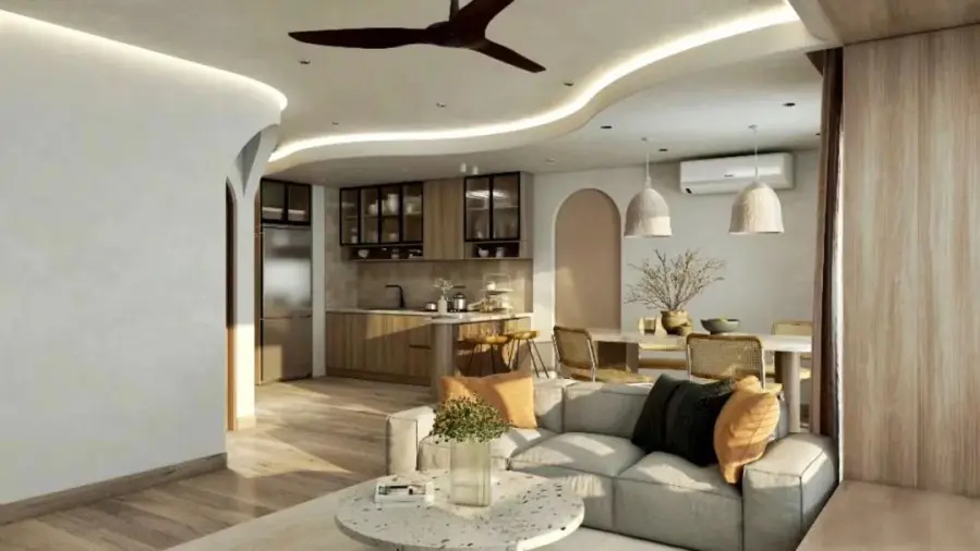 适合层高2.6米以上,层高没有优势的建议可以选边吊,不压层高,视觉上有层次感,好看且性价比高,搭配灯光更有氛围;单侧或双侧长进行下吊20公分,不对宽做任何处理,视觉上可以拉长客厅,减少厚重感。