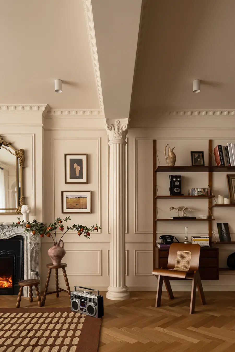 客厅的墙壁采用了典雅的奶油色调,搭配着精致的石膏线装饰,延伸到天花板,一气呵成,犹如一个法式画卷般展现出浪漫与优雅。