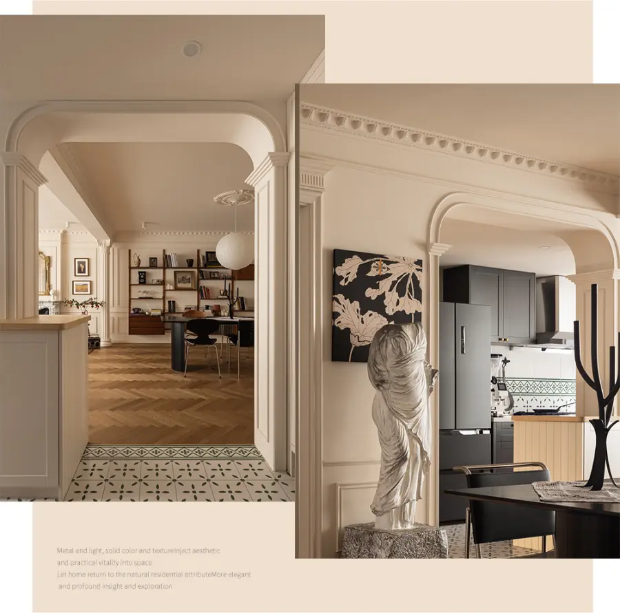 艺术元素的融入为空间注入了深厚的文化底蕴和艺术魅力,通过精巧的设计和搭配,从而展现出了法式独特的优雅和浪漫。