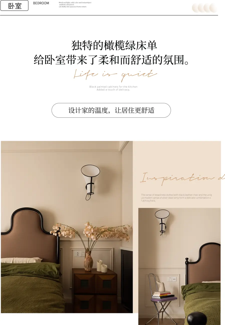 奶油色的墙壁与独特的橄榄绿床单形成了一种令人温暖心怡的搭配,给卧室带来了柔和而舒适的氛围。