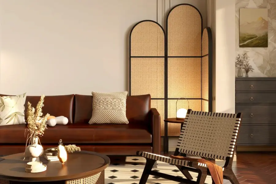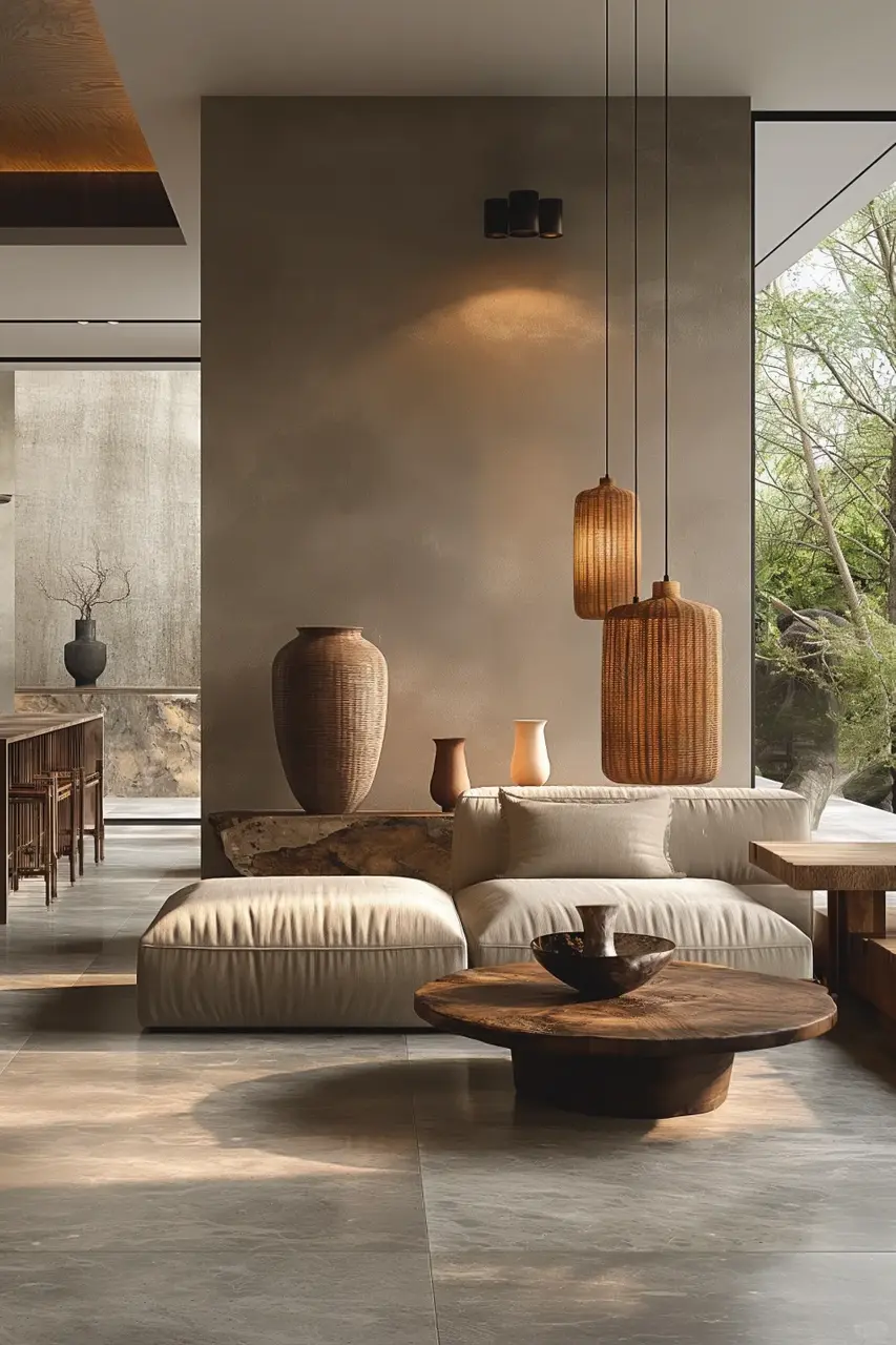 材质上,侘寂风通过运用实木、编藤、石材和棉麻布料,展现出沉静而富有禅意的氛围。