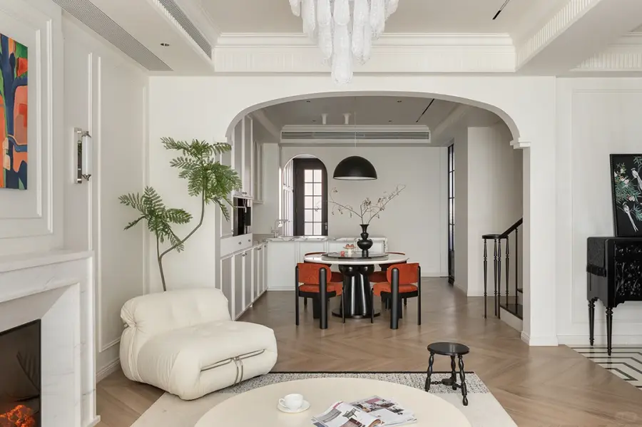 法式风格注重细节和雕刻工艺,墙面多用石膏线搭配角花呈现法式韵味。软装材质上偏爱丝绸和绒布等,也常常使用金色或象牙白的细节点缀,使整个空间更加高贵而典雅。