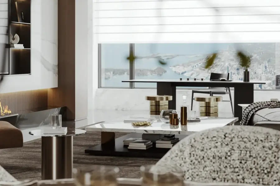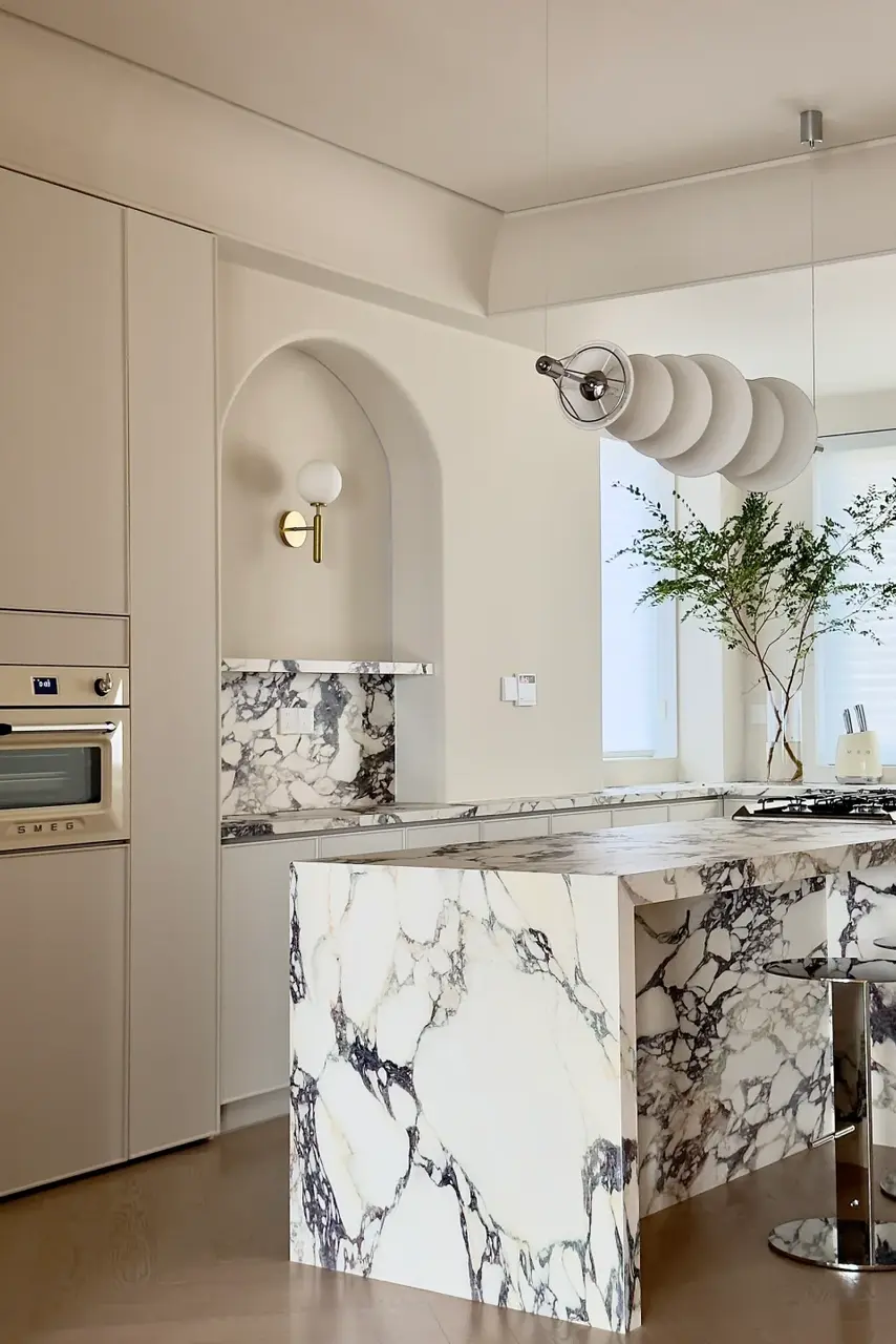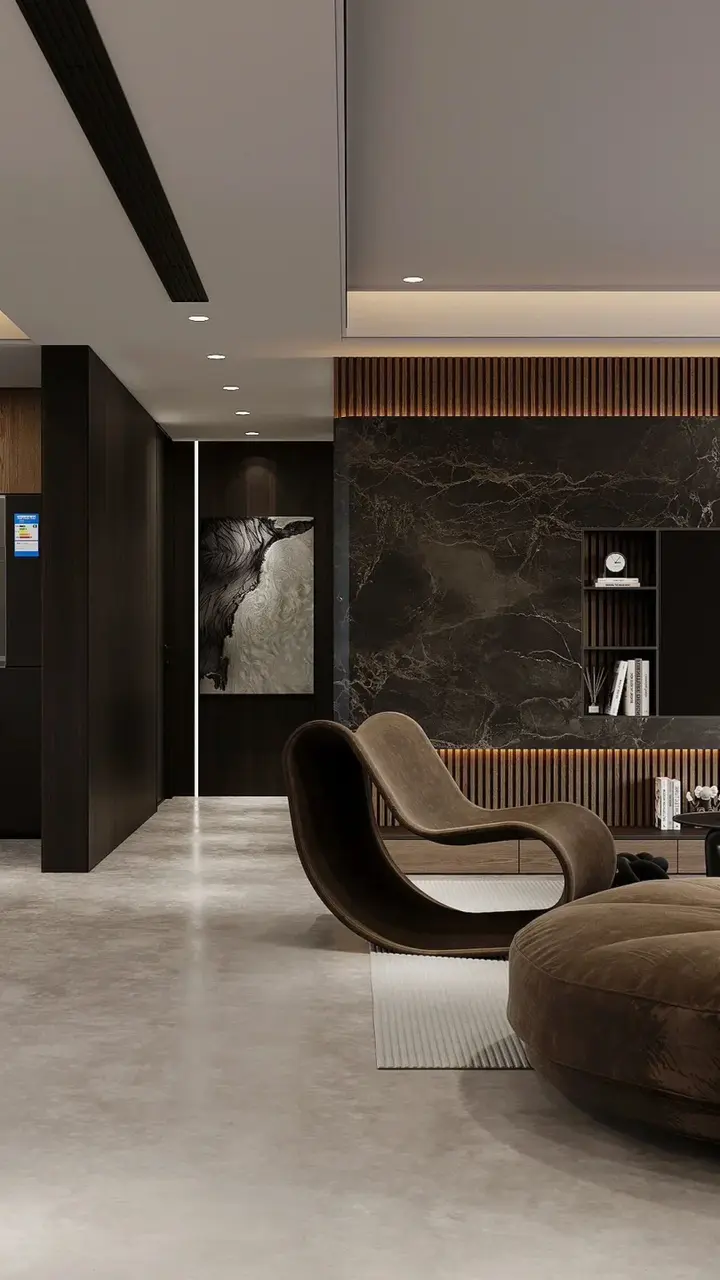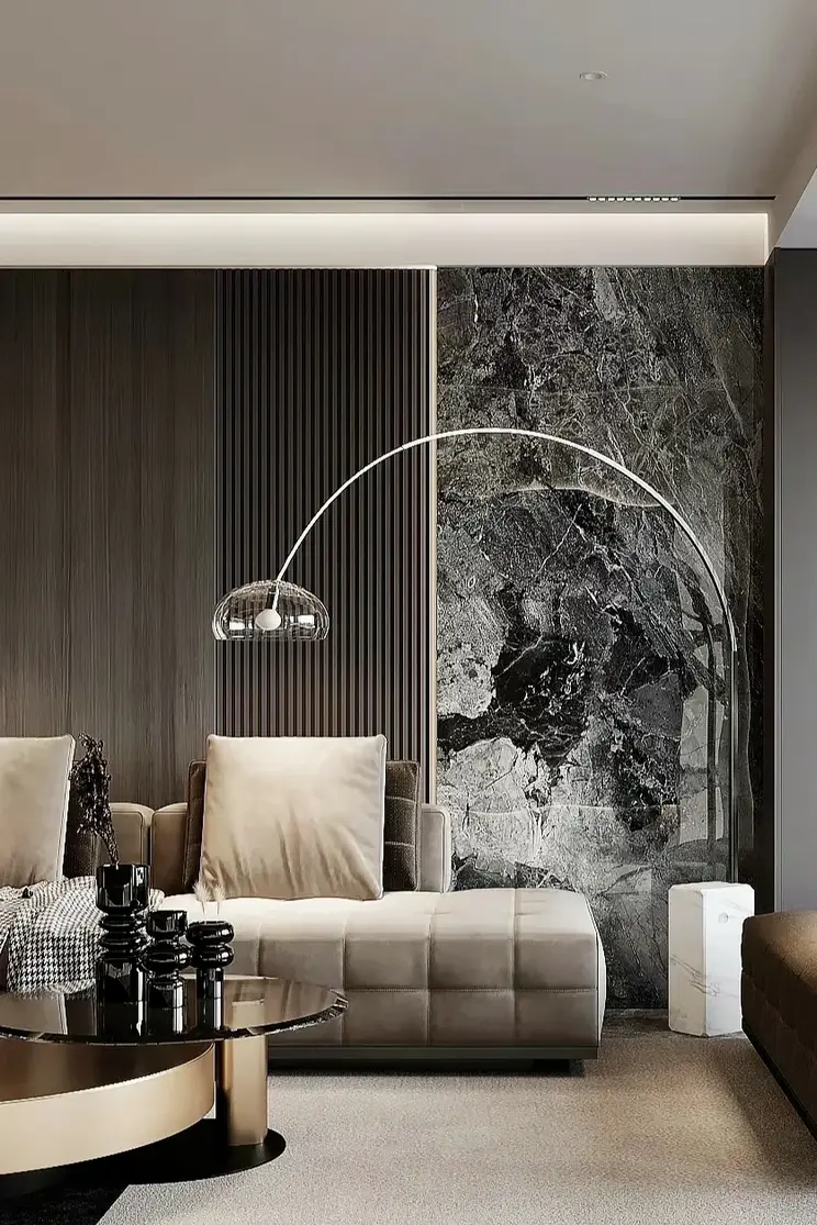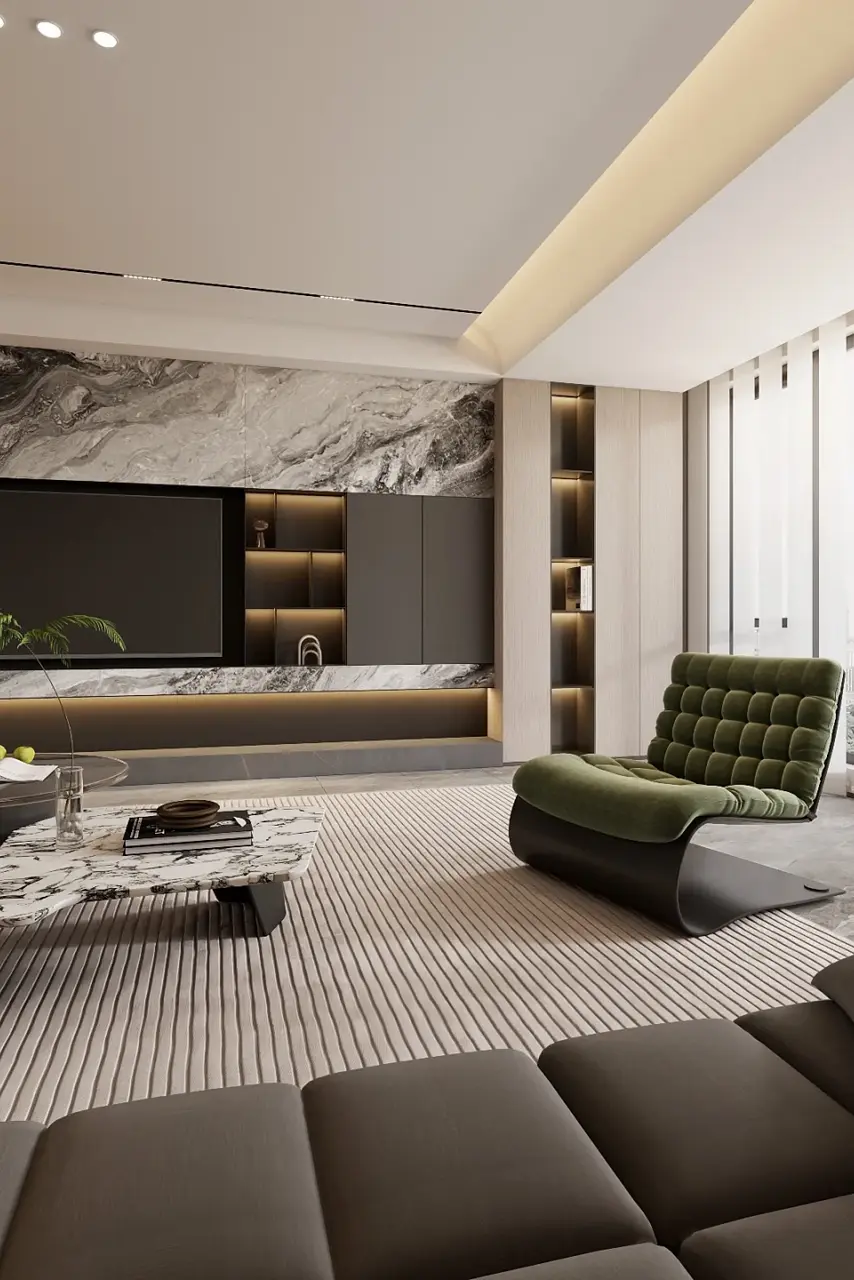 造型上,意式轻奢强调线条的流畅度和多材质的碰撞感。常常使用高档大理石、岩板、金属和皮革元素,增加细节的精致度,色彩上多以温暖的中性色为主调,融入耐看的大地色系作为点缀,打造出高雅奢华的家居风格。