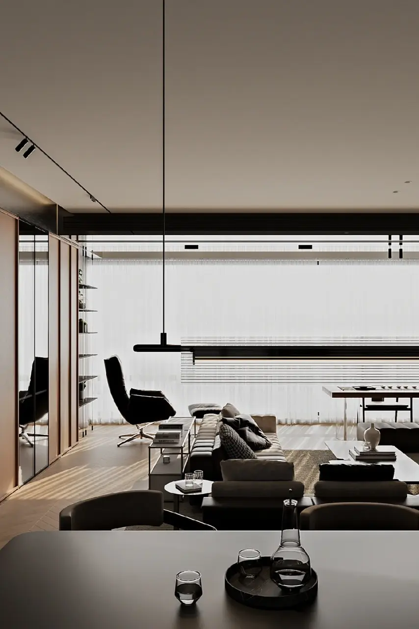 材质上多采用现代材料,如玻璃、铁艺和混凝土等,色彩上则以白色、灰色和黑色为主。家具力求简洁,没有多余的装饰,仅以凝练的设计突出纵深,营造冷静的氛围。