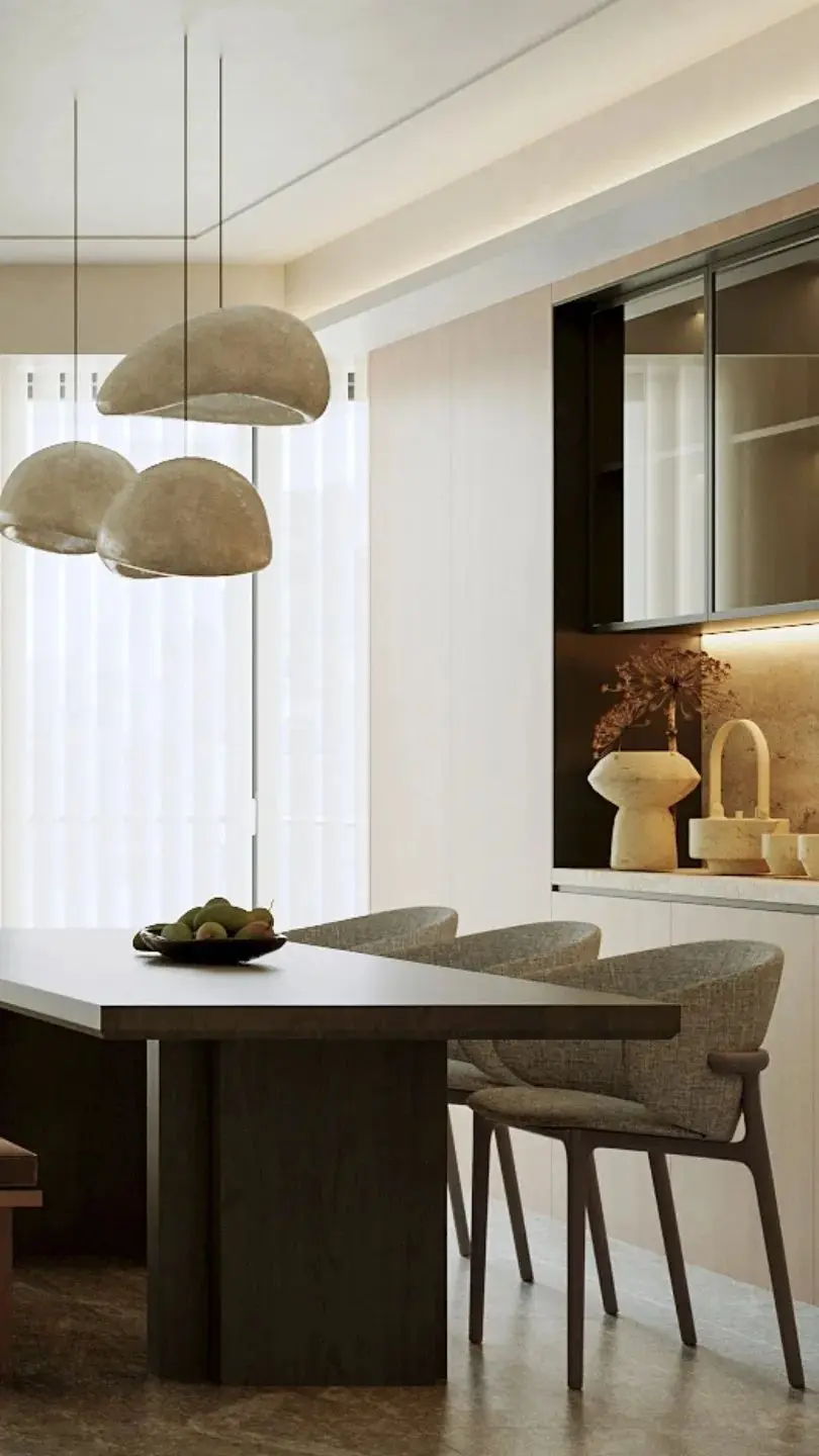 色彩上多使用灰、白、棕等克制的自然色调,钟爱艺术漆、微水泥等富有肌理感的墙面,打造自然纹理,还原事物本质。