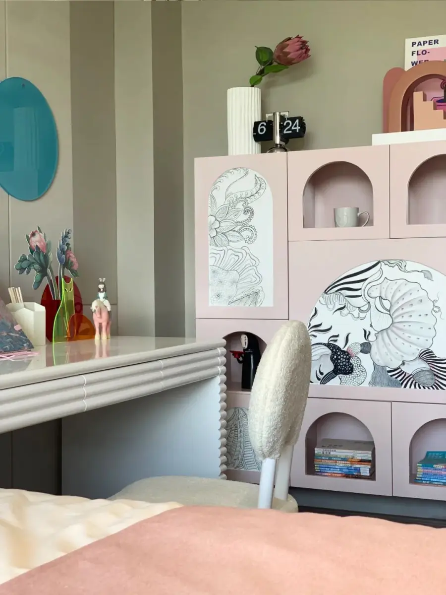 大面积使用灰咖色系,通过粉色系软装作点缀,增添空间柔和温馨感。该案例儿童房面积不大,所以非常注重空间功能规划。衣柜一侧连接书桌,既不会占用过多空间,又考虑到实用性。软装上,利用充满童趣感的摆件为空间营造属于儿童的天真烂漫!