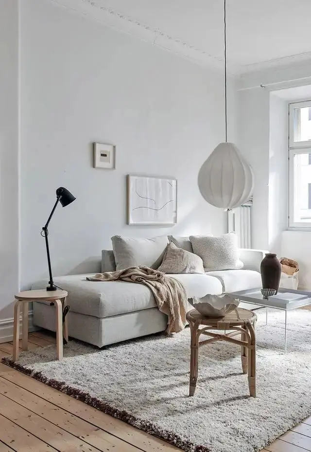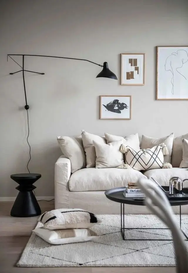 如:这间公寓的墙壁、沙发和软装都是类似的浅米色,营造出宽敞和谐的感觉。