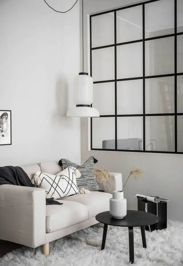 如:上图的沙发并不是直接靠着墙面摆放的,这样就会形成一种墙壁在远处的错觉,所以视觉上空间就会显大。而下图,镂空的置物架,则会让整个空间更显通透敞亮。