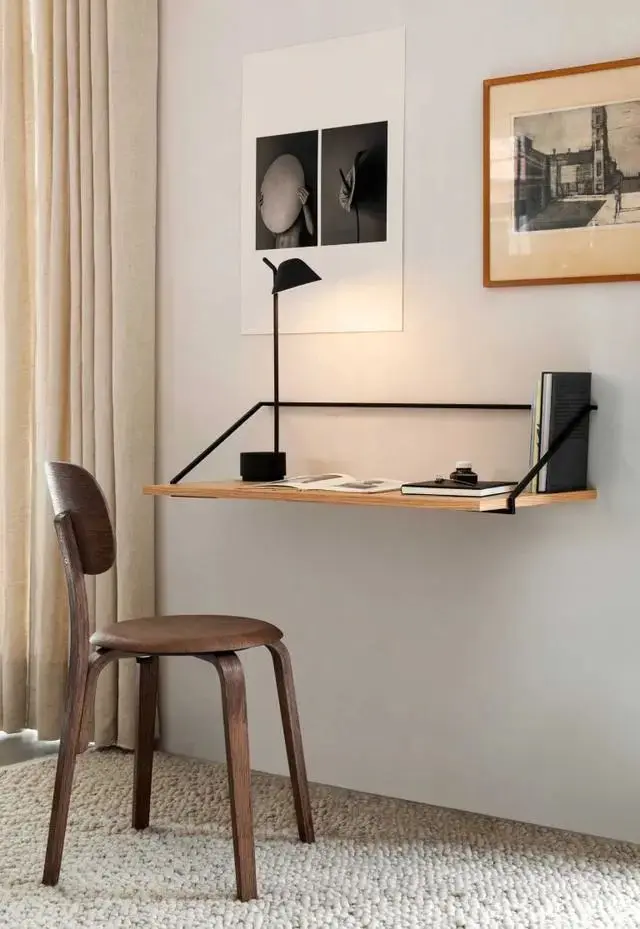 如:上图的壁挂式床头柜和台灯,下图的搁板式工作台,对小空间来说,都是特别实用方便的。