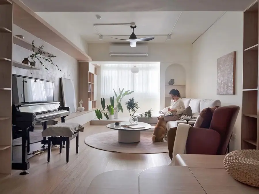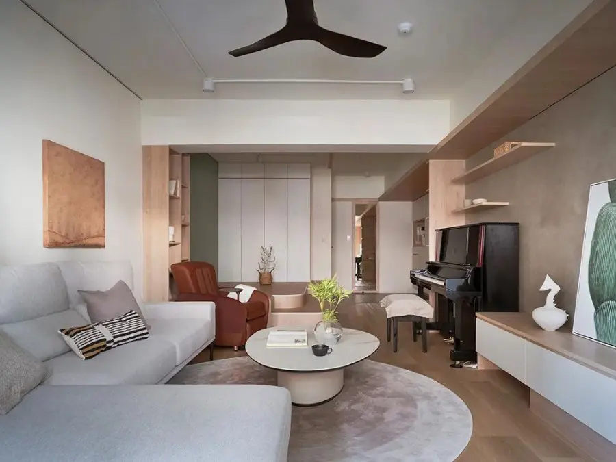 以木纹装饰横梁,贯穿整个客厅,营造出温暖稳重的氛围。天花板没做吊顶,一扇三叶吊扇,带来悠闲的气息。